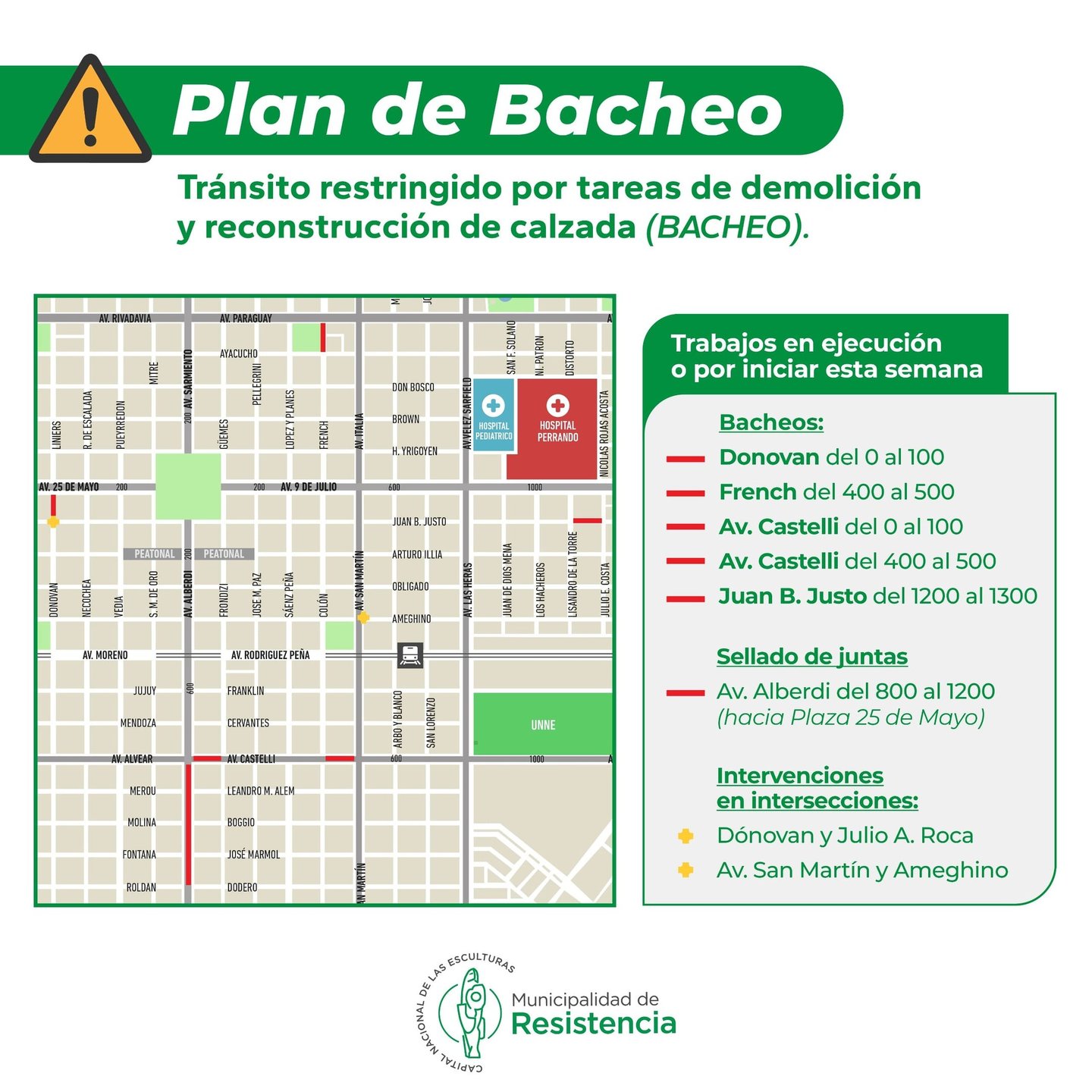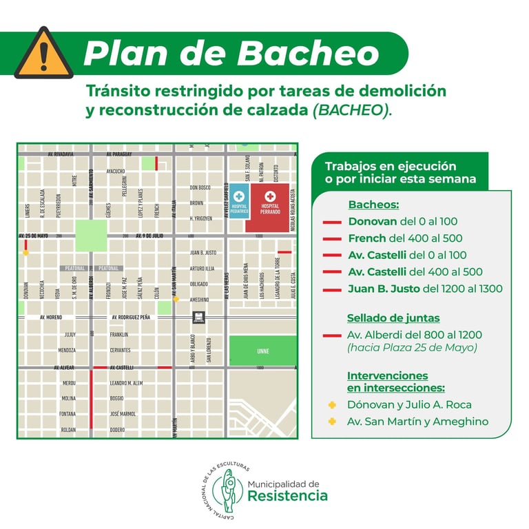 [22/09/2024] - La Municipalidad de Resistencia y la Dirección de Vialidad Provincial informan cuáles serán o están siendo intervenidas las calles y avenidas, esta semana, en el marco del Plan de Bacheo 2024. En todos los casos, el tránsito vehicular estará restringido e inspectores viales regularán la circulación.