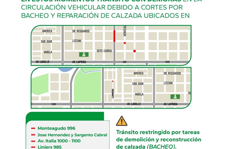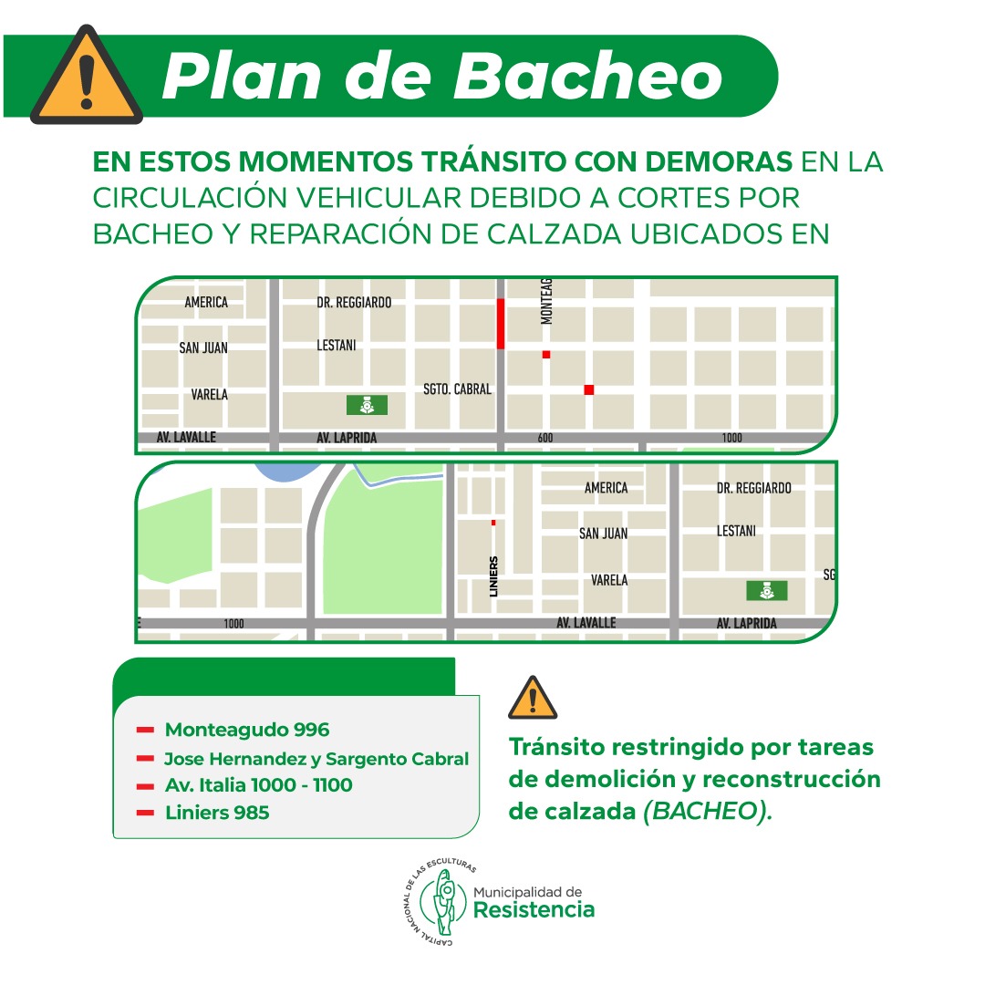 [26/11/2024] - La Municipalidad de Resistencia y Vialidad Provincial informan que por el Plan de Bacheo 2024 habrá tránsito restringido en las siguientes calles: Monteagudo 996, José Hernández y Sargento Cabral, avenida Italia 1.000 al 1.100 y Liniers 985.