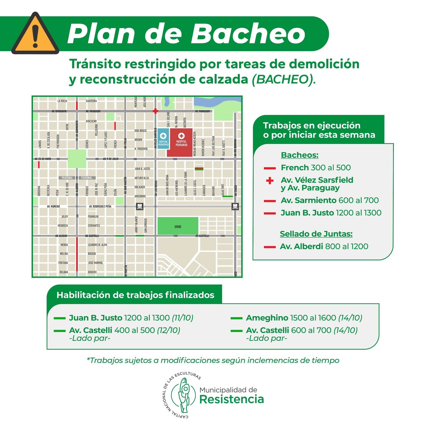 [08/10/2024] - La Municipalidad de Resistencia y Vialidad Provincial informan los lugares donde se ejecutan los trabajos de bacheo y los próximos a habilitarse para el tránsito. Se recuerda que la circulación vehicular estará restringida en los puntos de intervención, siendo regulados por inspectores viales.
