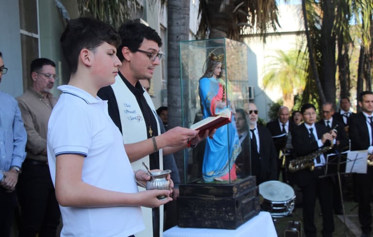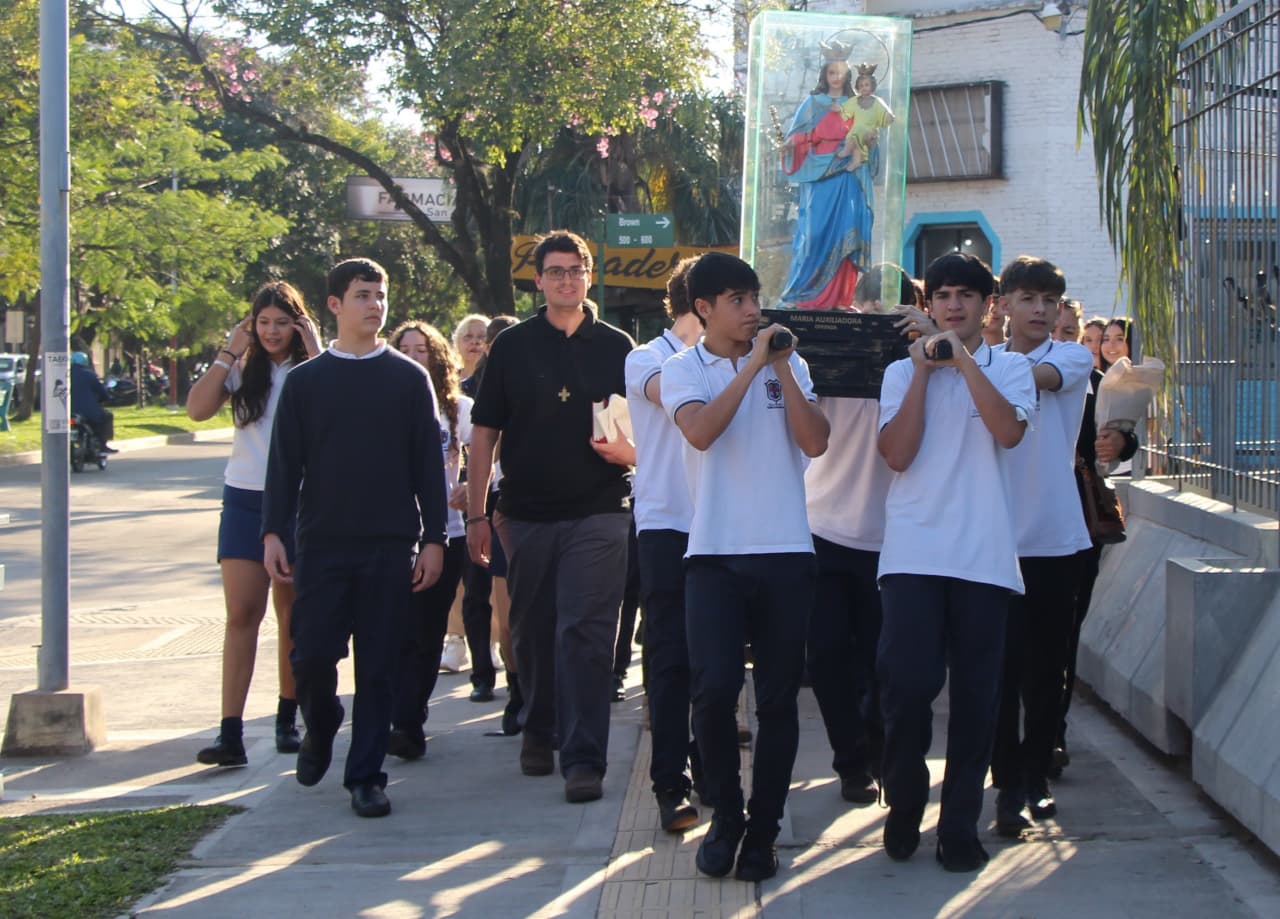 [22/08/2025-La imagen de María Auxiliadora estará en la Municipalidad de Resistencia hasta el jueves 28 de agosto, como parte de la serie de visitas a instituciones públicas. Este viernes comenzó su recorrida por el Palacio Comunal, traída desde su Parroquia por alumnos de segundo año del Colegio Don Bosco, acompañados por el director Antonio Pedone.