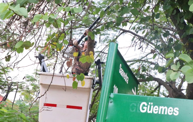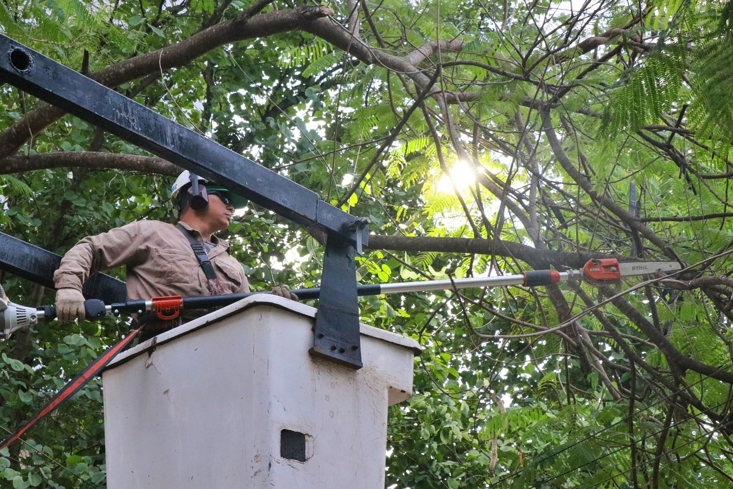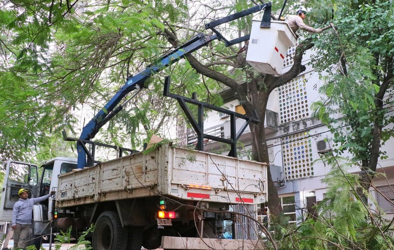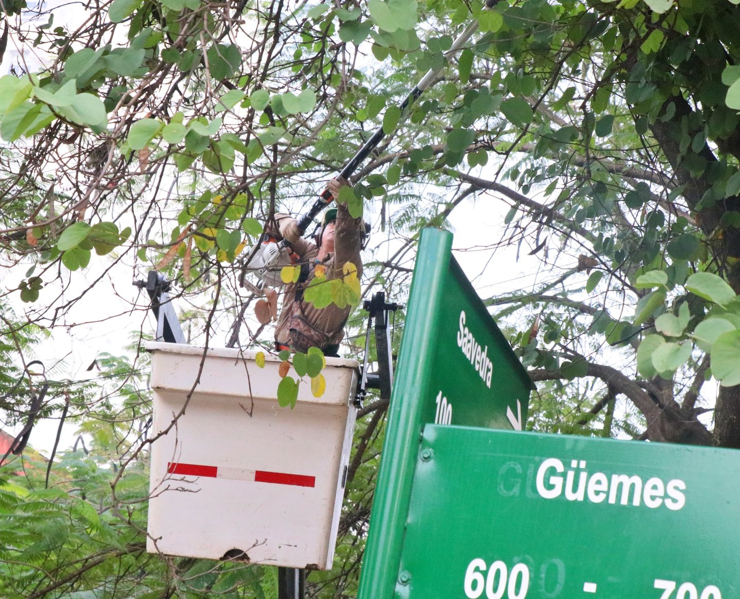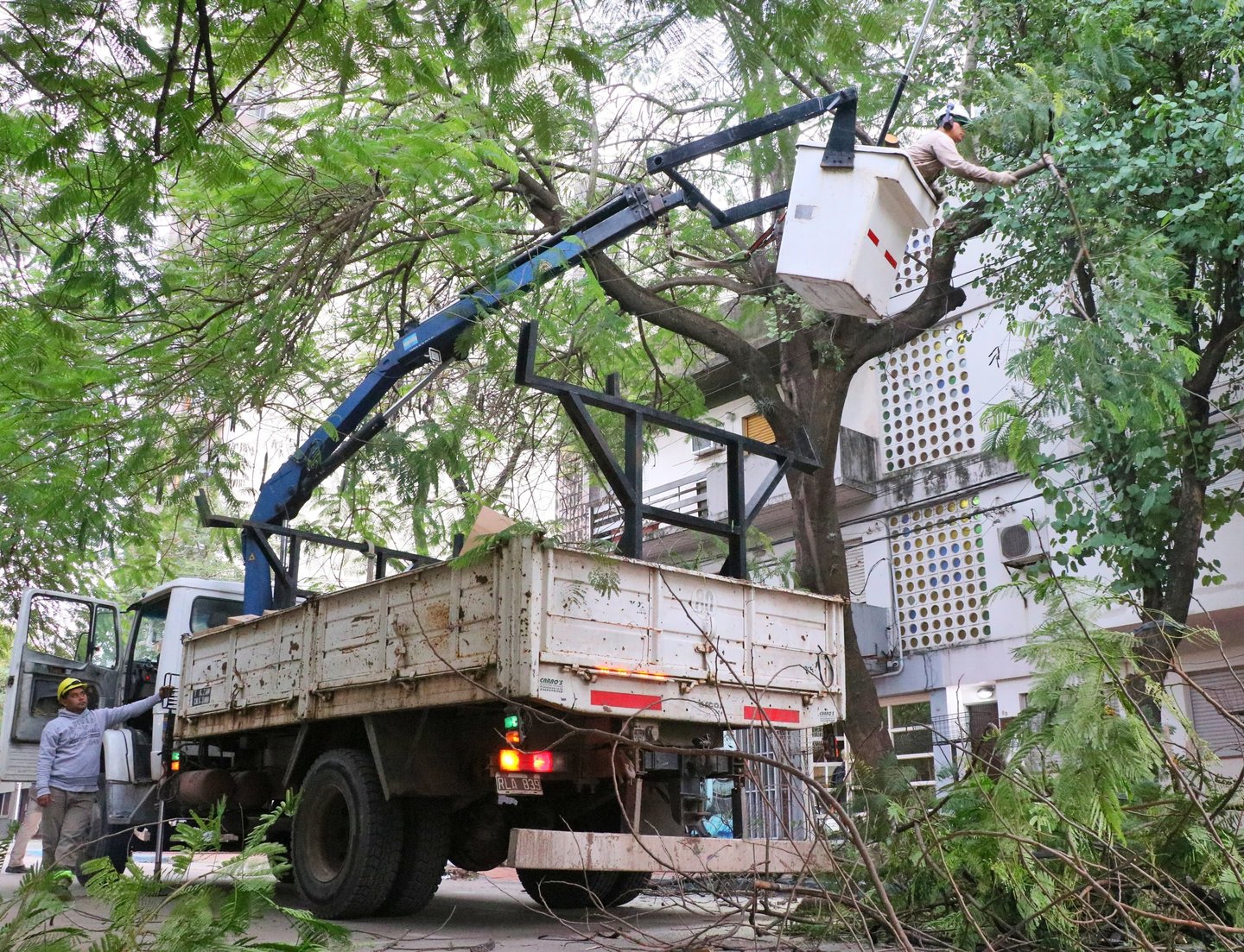 Los trabajos incluyen el despeje de farolas y cableado, retiro de ramas peligrosas y control de árboles secos, contribuyendo con el mantenimiento de la vegetación de la Ciudad.