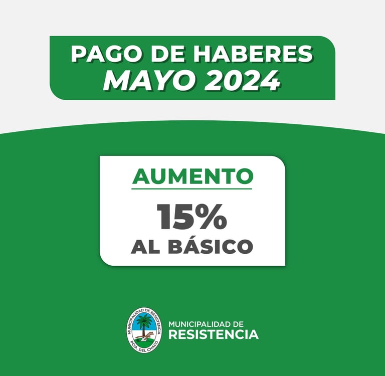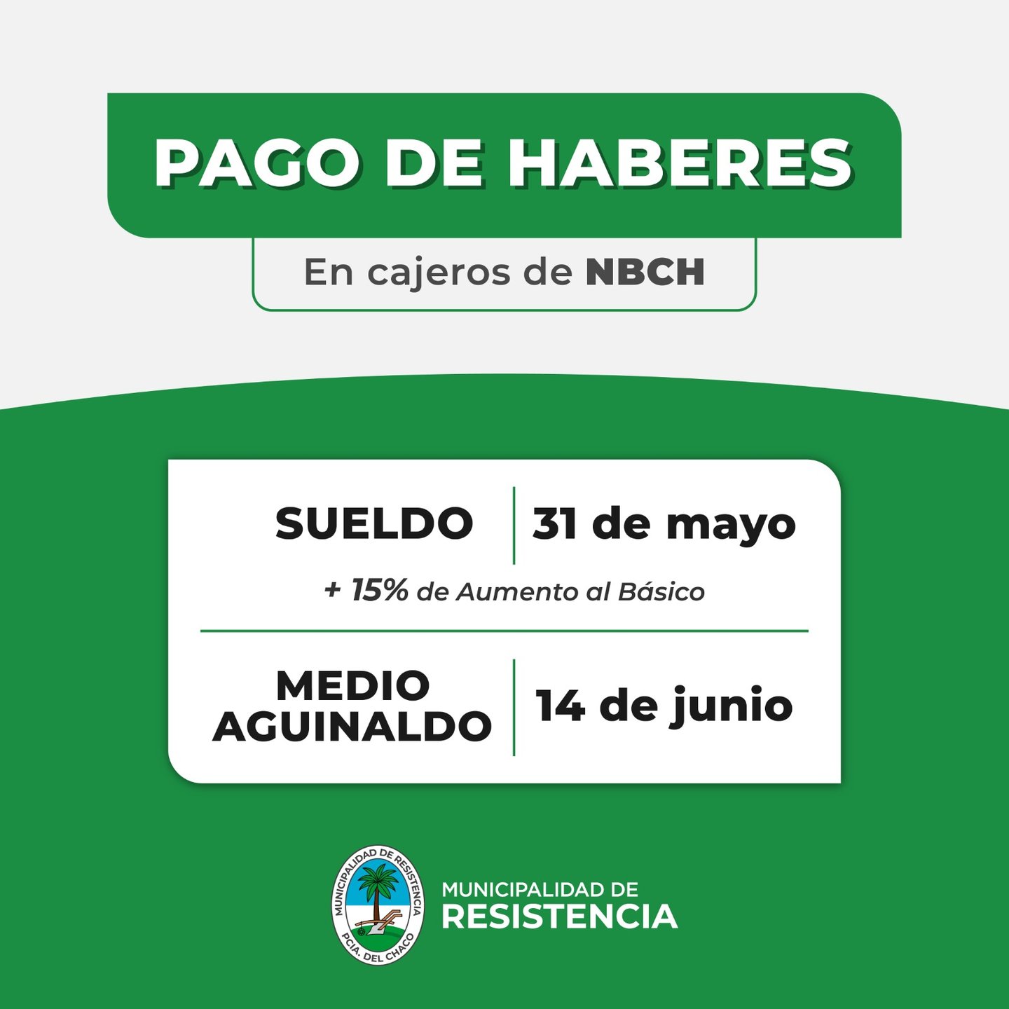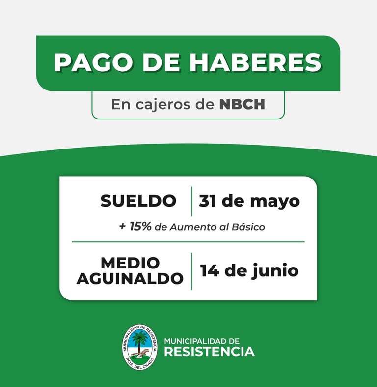 [22/05/2024] -La Municipalidad de Resistencia pagará los salarios correspondientes al mes en curso el próximo 31 de mayo. Será con un nuevo aumento al salario básico. A su vez, el viernes 14 de junio abonará el sueldo anual complementario.