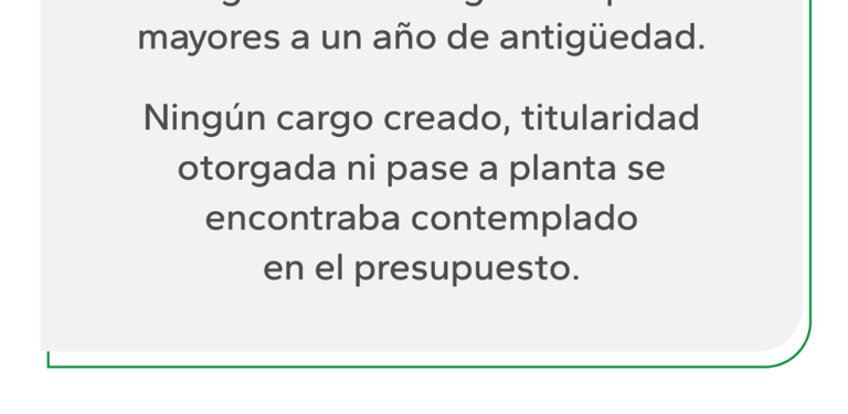 "La anterior gestión no presupuestó los cargos que fueron titularizados ni tampoco los pases a planta permanente y, otra cosa que nos llama la atención, es que en marzo de 2023 hablaban de la necesidad de hacer un redimensionamiento de la planta municipal porque los costos salariales estaban por encima de lo presupuestado, pero siete meses después pasaron a planta 811 agentes municipales, generando un caos administrativo y un daño a las familias a las que se le crearon falsas expectativas".