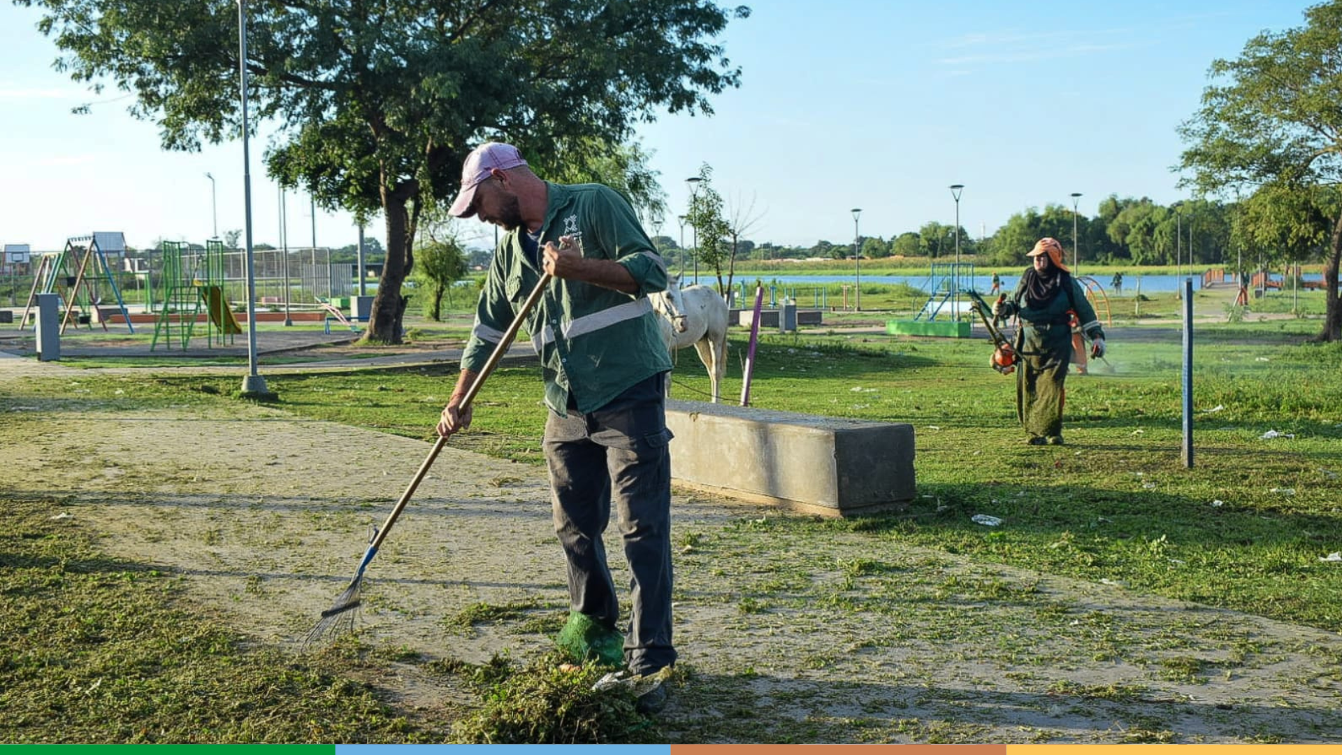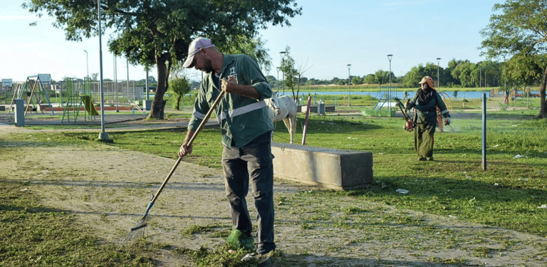 [06/03/2024] -Las tareas de limpieza urbana que ejecuta la Municipalidad de Resistencia, convocó a personal de distintas dependencias a la plazoleta del barrio Don Bosco, un pulmón verde de grandes dimensiones y que necesitaba de un operativo de saneamiento integral.