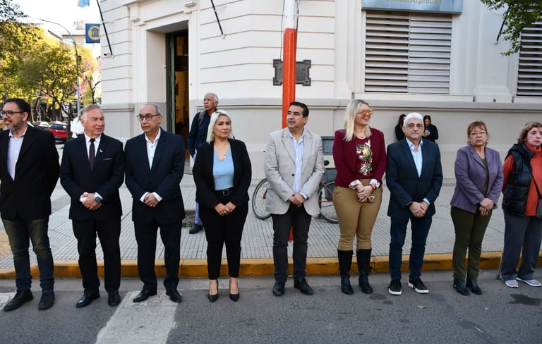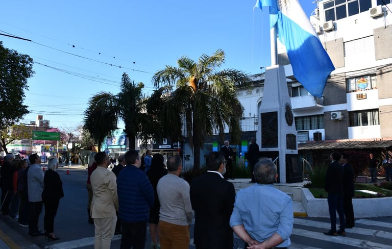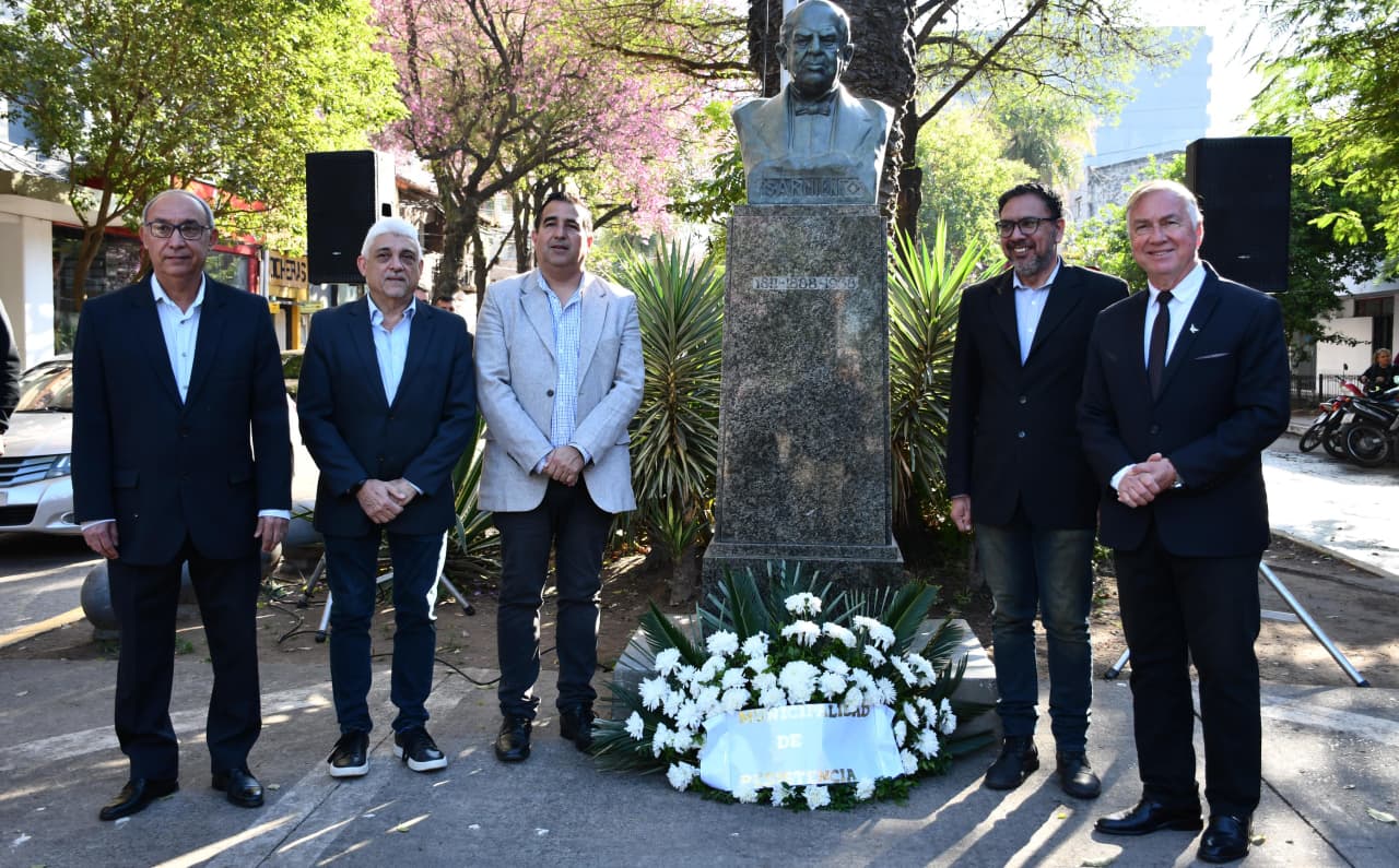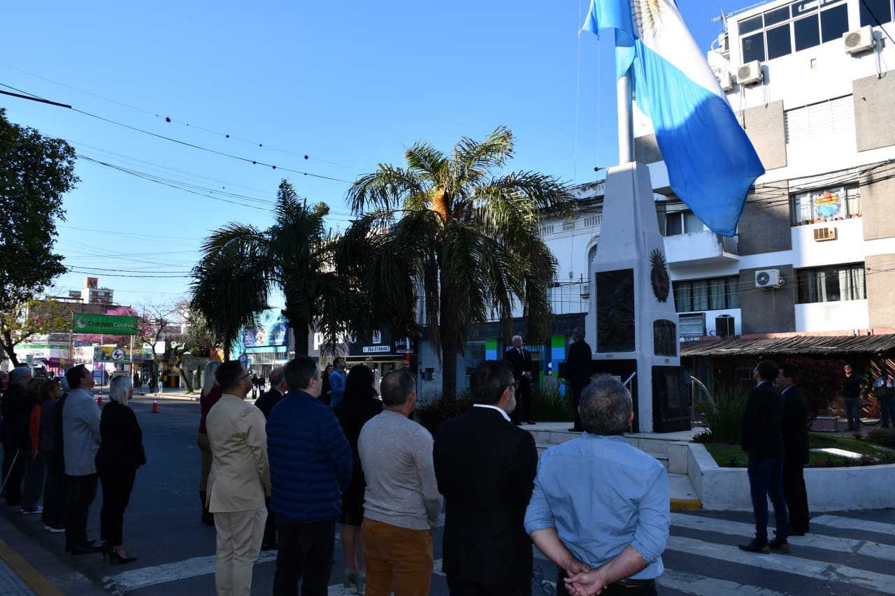 La ceremonia se inició con el izamiento de la Bandera Nacional en el Mástil Mayor, para luego continuar en el busto que el Padre del Aula tiene sobre avenida Sarmiento al 100.