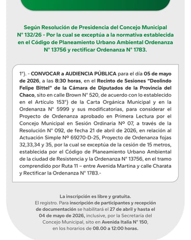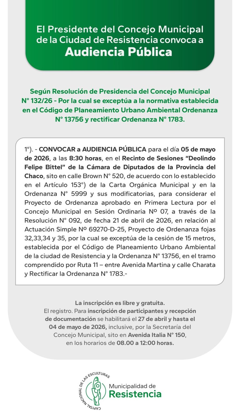 ✅El presidente del Concejo Municipal de la ciudad de Resistencia convoca a una audiencia pública a realizarse el 5 de mayo, a las 8:30 horas, en el recinto de sesiones “Deolindo Felipe Bittel” de la Cámara de Diputados, sito en calle Brown 520.