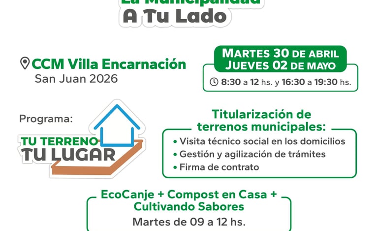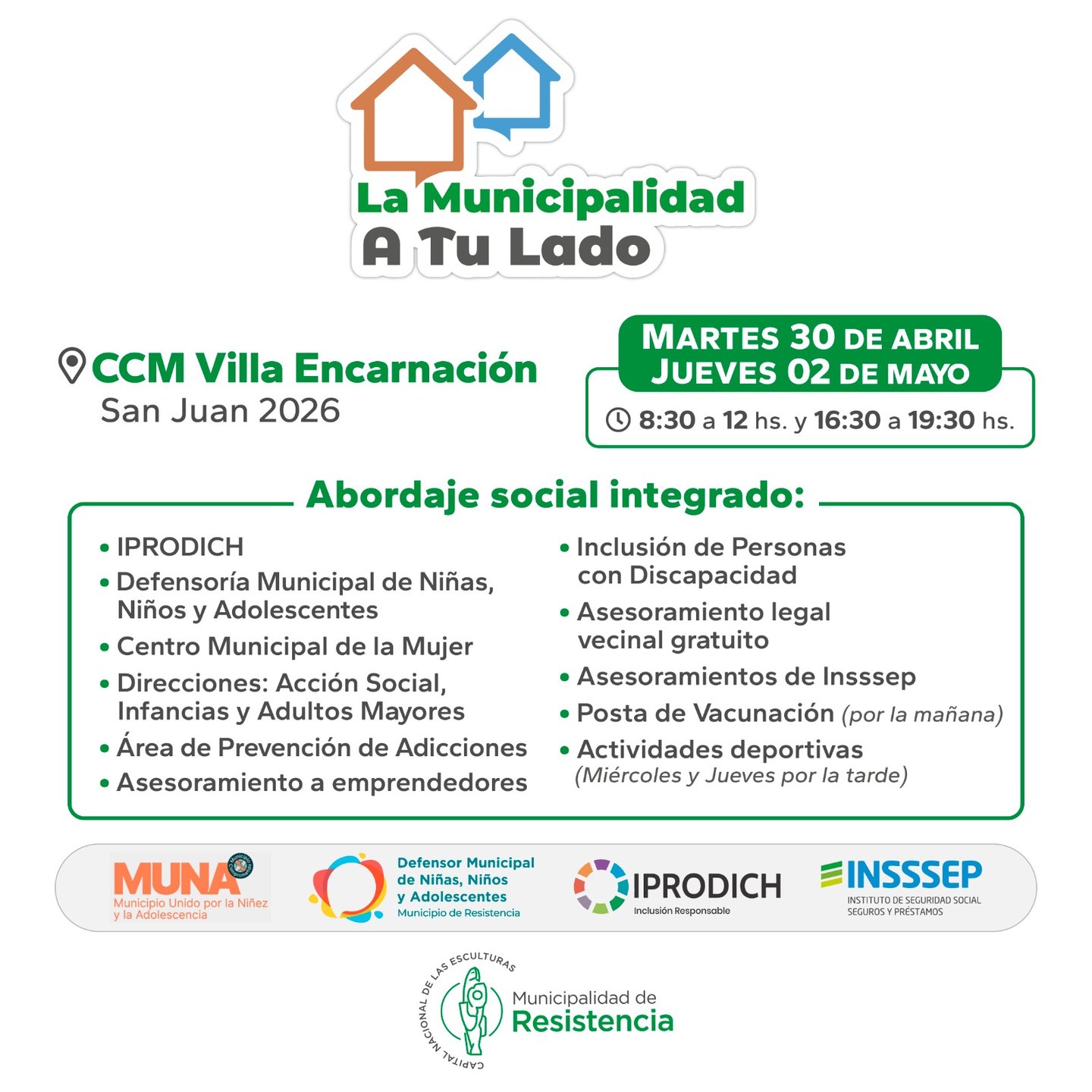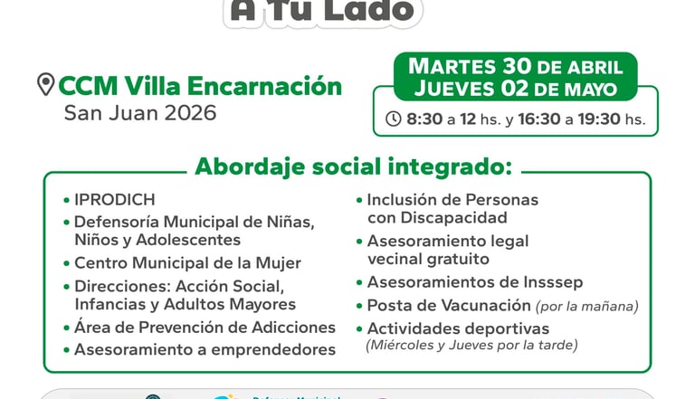 [29/04/2024] - El programa “La Municipalidad a tu lado”, se presentará este martes 30 de abril y el jueves 2 de mayo en el Centro Comunitario de Villa Encarnación, sito en calle San Juan 2.026, de 8.30 a 12 y de 16.30 a 19.30 horas.