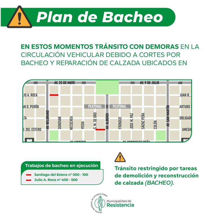 En la semana que abarca de del 2 a 6 de diciembre se registrarán demoras en el tránsito por trabajos de bacheo y reparación de calzada en: avenida Castelli del 00 al 100; avenida Italia del 1000 al 1200; French del 1000 al 1100; en la intersección de José Hernández y Santiago Cabral; en Santiago del Estero del 00 al 100; y Julio A. Roca del 400 al 500.