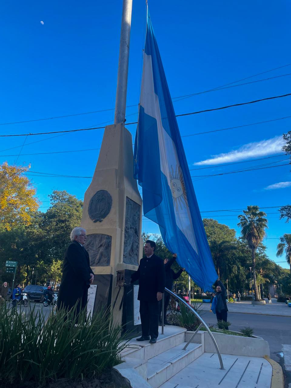 [28/05/2024] - En el Día del Ceremonial Argentino se llevó a cabo el izamiento de la insignia nacional en el mástil mayor de avenida 9 de Julio con integrantes de protocolo de distintas fuerzas y reparticiones de la Provincia. Participaron las principales autoridades de ceremonial de los podes Ejecutivo, Legislativo, Judicial, del Municipio de Resistencia y del Ejercito Argentino.