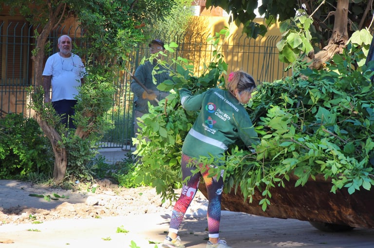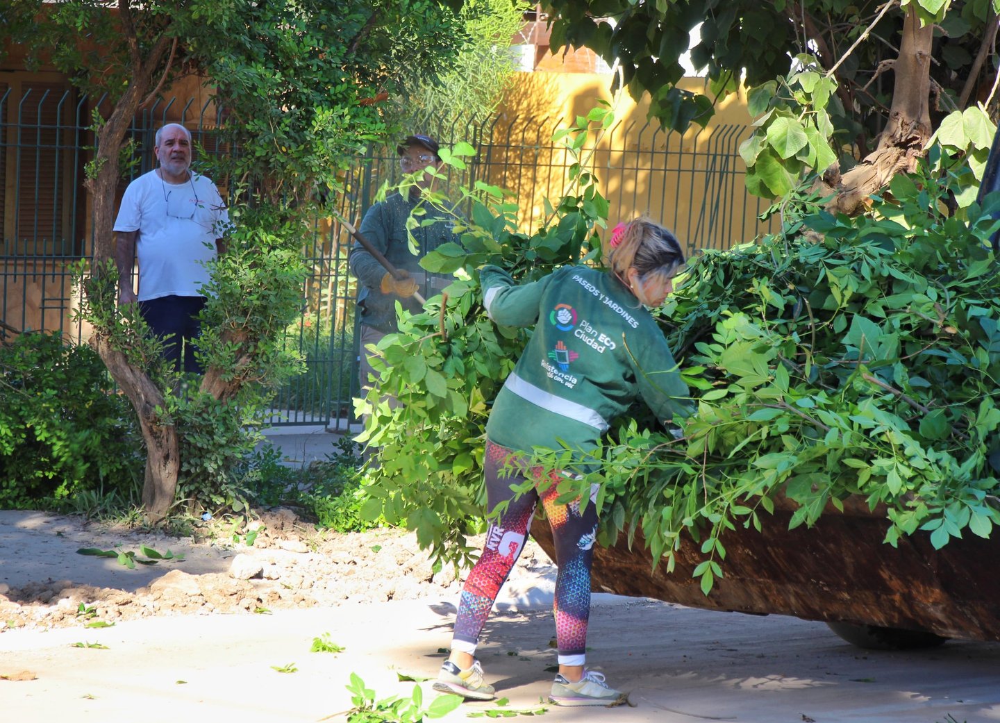 Además, del barrido manual se usan herramientas específicas para el desmalezado y el despeje de luminarias, utilizando también una minicargadora para recolectar y trasladar los restos verdes hasta el camión con batea. Avanzaron por calle Monteagudo del 800 al 1600, y sus perpendiculares.