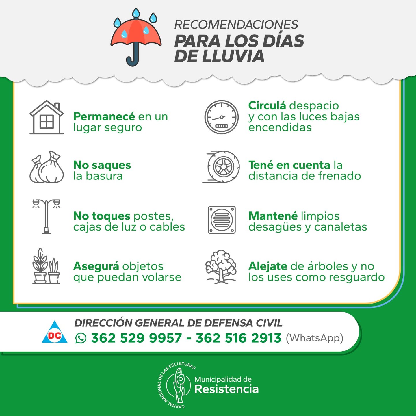 Ante las importantes lluvias y el pronóstico que anticipa la continuidad del mal tiempo, desde la comuna capitalina enviaron también una lista de recomendaciones para evitar mayores complicaciones: Permanecer en un lugar seguro; no sacar los residuos a la calle; no tocar postes, cajas de luz o cables; asegurar cualquier objeto que pueda volarse; automovilistas, circular despacio y con las luces bajas encendidas; tener en cuenta las distancias de frenado; mantener limpios los desagües y canaletas; alejarse de los árboles y no usarlos para guarecerse de la lluvia.