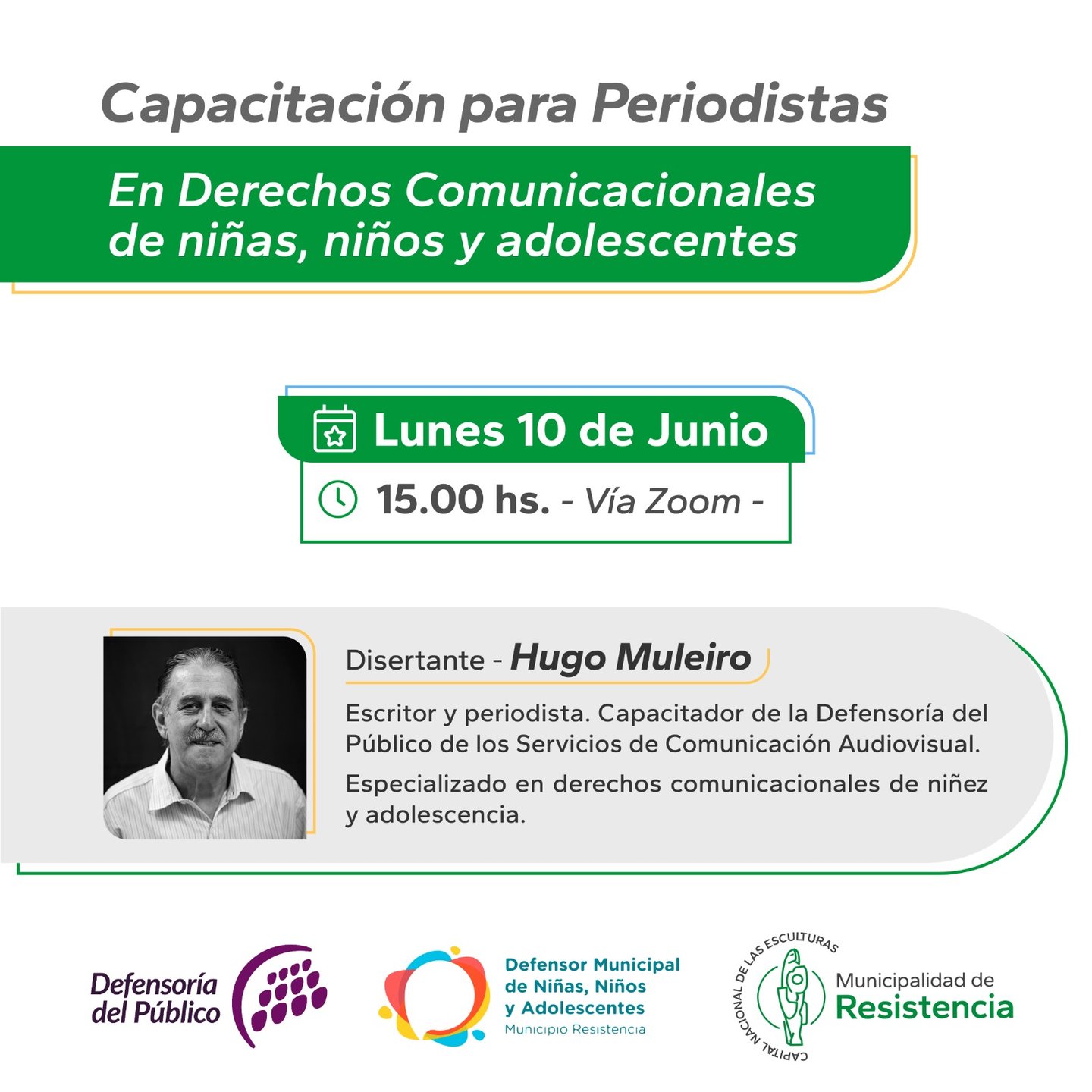 [07/06/2024] - La Municipalidad de Resistencia, junto a la Defensoría de Niños, Niñas y Adolescentes y la Defensoría del Público organiza una capacitación para conmemorar el Día del Periodista. Se realizará el lunes 10, a las 15 horas, vía Zoom.
