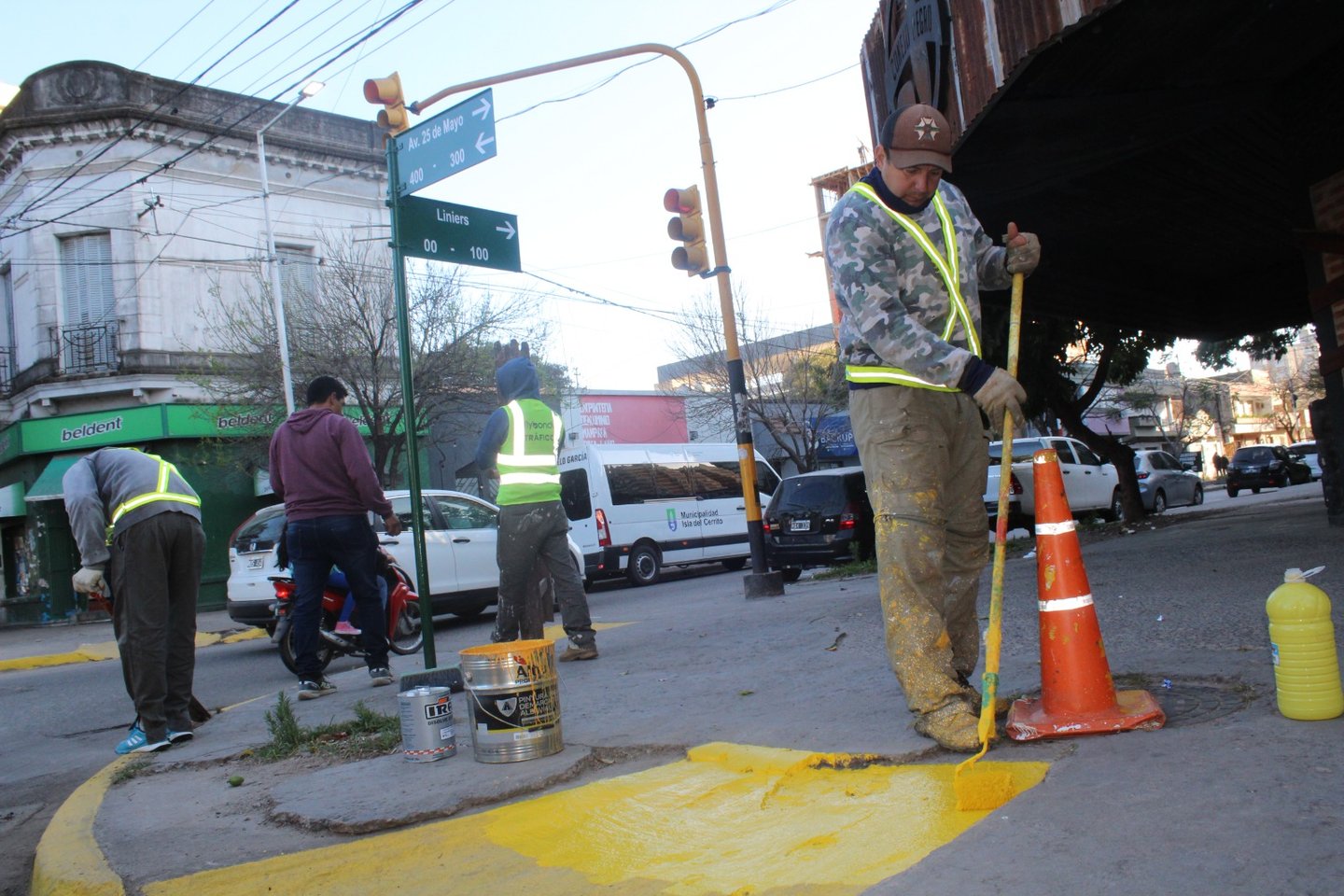 Para brindar mejor ubicación a conductores y peatones se pintan las ochavas, los cordones y las rampas de accesibilidad. También se reparan y pintan los carteles con señales de tránsito, los nomencladores verticales de las calles y columnas de iluminación.