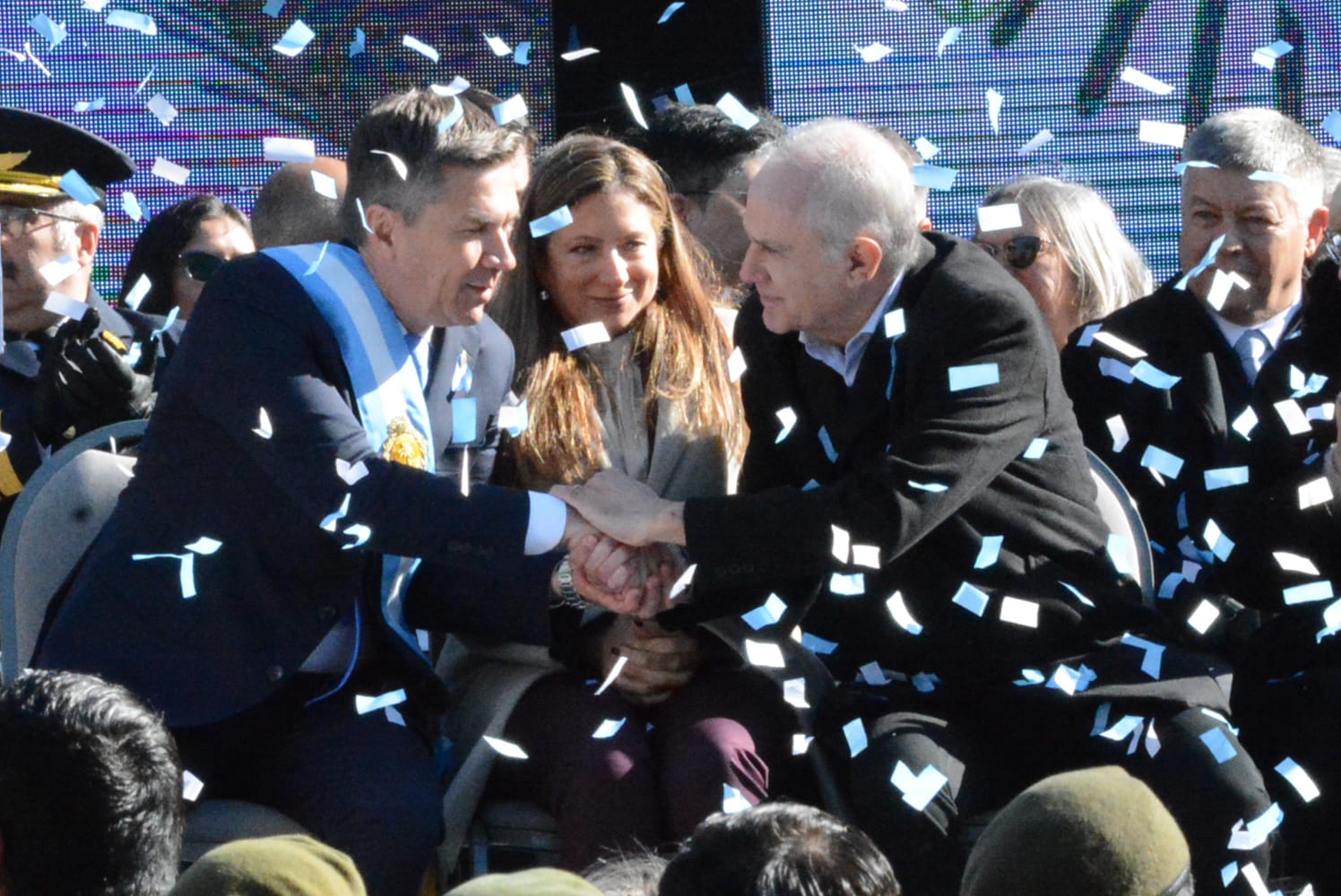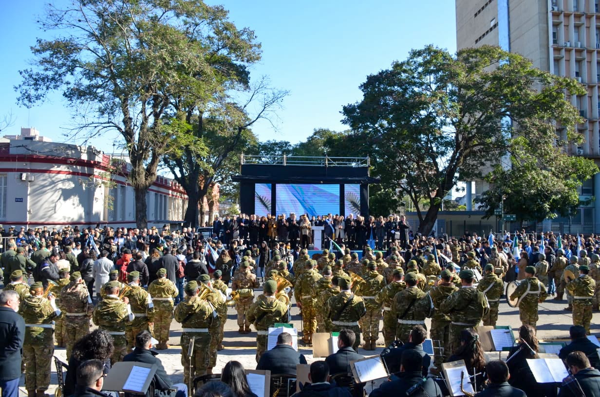 El palco central se ubicó frente a la Plaza 25 de Mayo, entre calles Mitre y Santa María de Oro, donde Zdero y Nikisch saludaron a las tropas para luego entonar las estrofas del Himno Nacional Argentino.