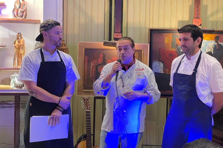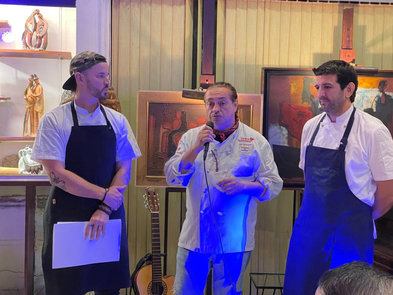 Gunther Moros (Misiones), Vidal Domínguez (Paraguay) y Carlos Lösch (Resistencia), fueron los chefs que estuvieron a cargo de las recetas que se disfrutaron durante la velada, en un espacio emblemático para la cultura de la Ciudad, como lo es el Fogón de los Arrieros. Los tres tuvieron la responsabilidad de reflejar en cada uno de los platos la identidad y las características culinarias de los dos países y su historia.