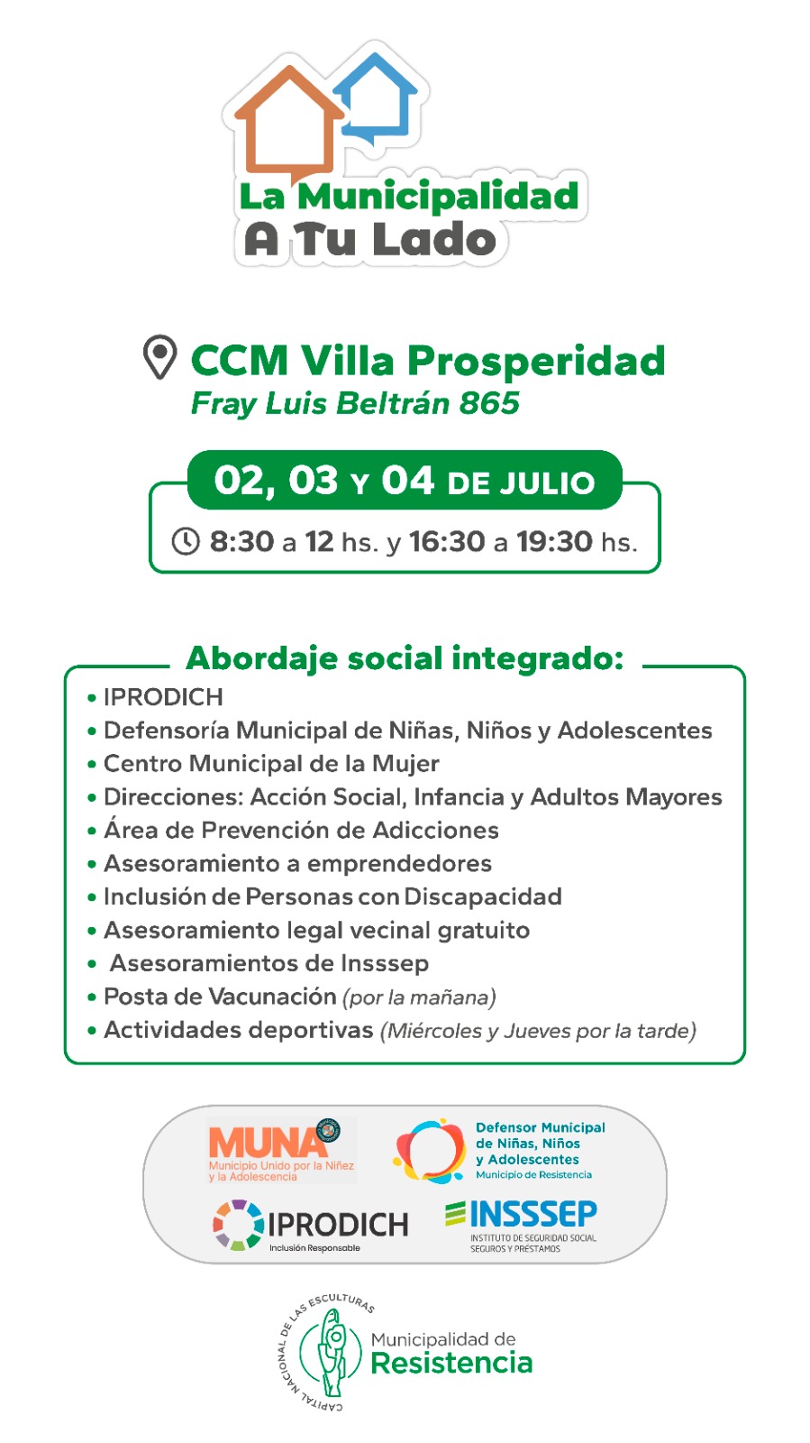 Asimismo, por medio de la Secretaría de Desarrollo Humano, se desarrollarán operativos de abordajes sociales integrados, con la colaboración del Instituto Provincial para la Inclusión de las Personas con Discapacidad (IPRODICh), la Defensoría Municipal de Niños, Niñas y Adolescentes, Centro Municipal de la Mujer, Dirección de Acción Social, Dirección de Adultos Mayores, Área de Prevención de Adicciones, Inclusión de Personas con Discapacidad, exámenes bucodentales para niños y adolescentes, posta de vacunación (por la mañana) y actividades deportivas (por la tarde).