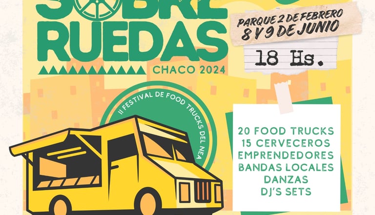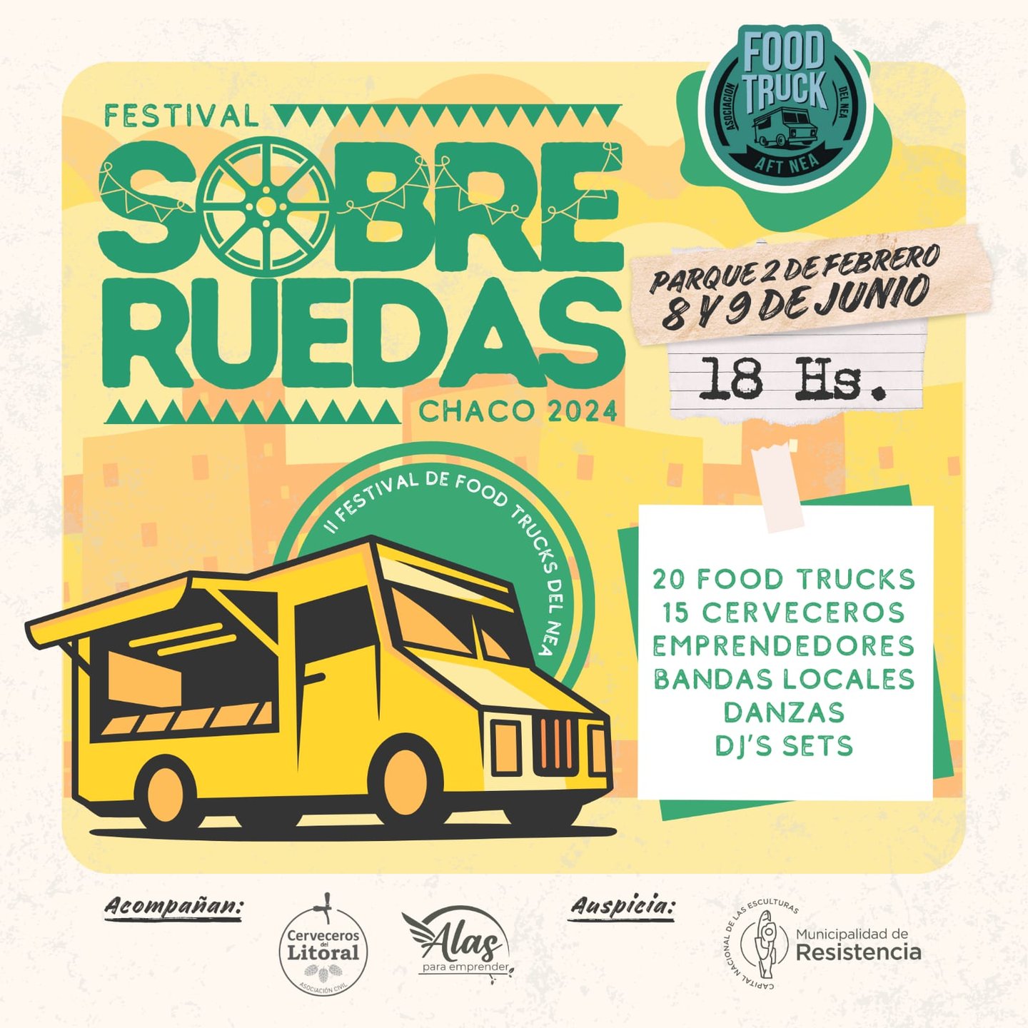 [06/06/2024] - La Municipalidad de Resistencia invita al Festival Sobre Ruedas que tendrá lugar los días sábado 8 y domingo 9 de junio en la pista de atletismo del Parque 2 de Febrero. Habrá más de 20 food trucks, cerveceros artesanales, puestos de emprendedores, música en vivo, escuelas de danzas y todo lo necesario para pasar dos días de disfrute al aire libre; en familia o con amigos.