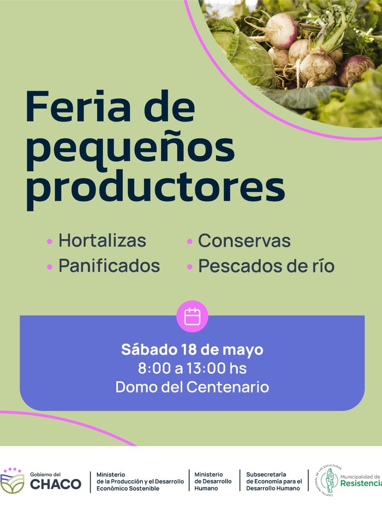 [15/05/2024] - La segunda edición de la Feria de Pequeños Productores se realizará este sábado 18 de mayo en el Parque Intercultural “2 de Febrero”. Con el acompañamiento del Municipio de Resistencia y la organización del Instituto de Agricultura Familiar y Economía Popular (IAFEP), de 8 a 13 horas la comunidad podrá aprovechar las ofertas de los distintos productos que estarán exponiéndose en el Pasaje Fabriciano.