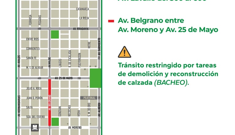 [03/07/2024] -La Municipalidad de Resistencia informa que por los trabajos de bacheo que se ejecutan en el macrocentro, habrá tránsito restringido por demolición y construcción de calzada en avenida Lavalle del 300 al 600 y avenida Belgrano, desde 25 de Mayo a Moreno. Demorará varios días y se informará al momento de finalizar la obra.
