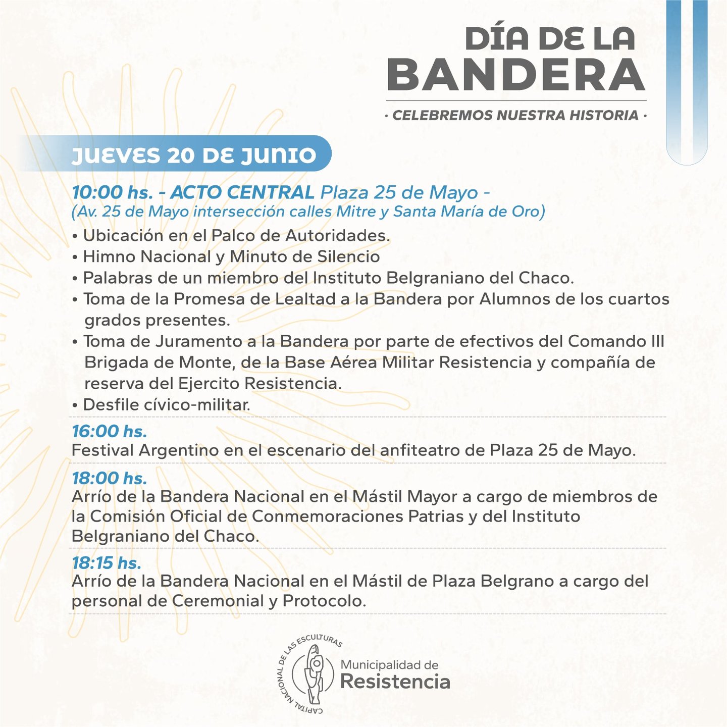 10 horas: Acto central en la Plaza 25 de Mayo. Toma de promesa de lealtad a alumnos de cuarto grado y de juramento a efectivos del Comando III de Brigada del Monte, Base Aérea Militar de Resistencia y Compañía de Reserva del Ejército.