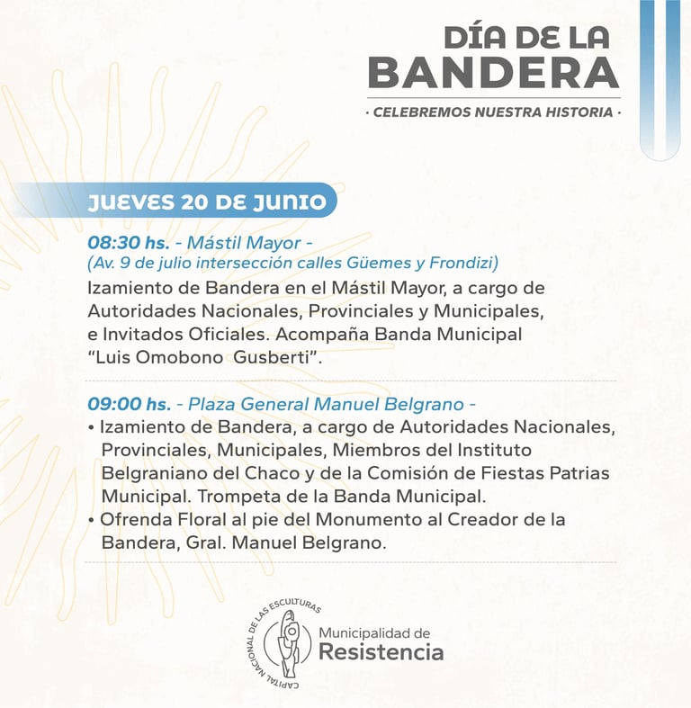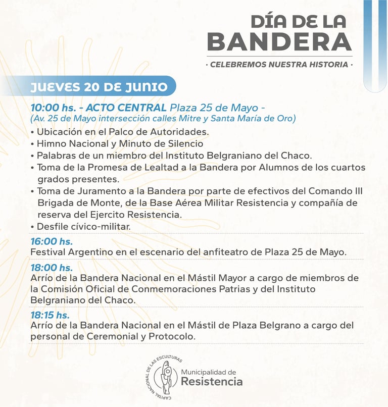 [19/06/2024] - La Municipalidad de Resistencia invita a la comunidad a celebrar el Día de la Bandera, este jueves 20 de junio, y que contempla la tradicional toma de promesa de lealtad a alumnos primarios y de juramento a integrantes de fuerzas de seguridad. Se prevén también un desfile cívico militar y un festival artístico.
