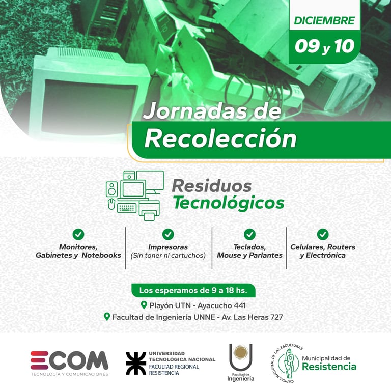 Este 9 y 10 de diciembre en Resistencia se llevarán a cabo Jornadas de Recolección de Residuos Tecnológicos, coordinadas por la Universidad Tecnológica Nacional (UTN), ECOM, la Facultad de Ingeniería de la UNNE y la Municipalidad de Resistencia.