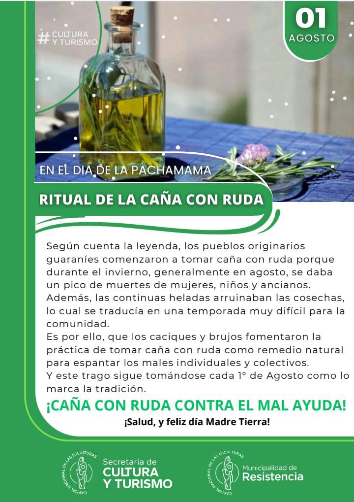 Cada 1 de agosto se conmemora el Día de la Pachamama o el Día de la Madre Tierra. Uno de los rituales más comunes es la caña con ruda, para espantar los males del invierno, hay que tomar un trago, en tres sorbos, de caña con ruda es mejor tomarla en ayunas, pero se admite durante toda la jornada ya que "no pierde su fuerza".