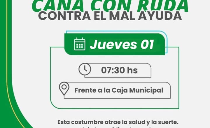 [30/07/2024] - Como cada año este jueves, 01 de agosto, la comuna invita a los vecinos a participar del tradicional convite de caña con ruda, la actividad se realizará a partir de las 7.30 horas frente a la Caja Municipal (Avenida Italia e Irigoyen).