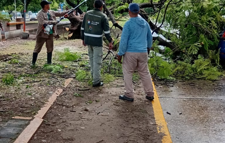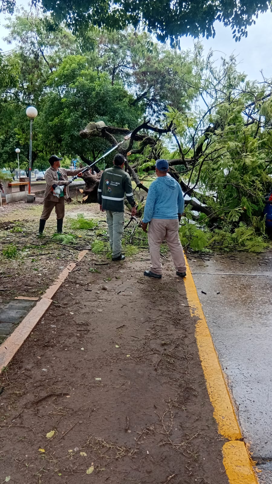 Además, se produjeron caídas de ramas y árboles en Franklin 450 y en avenida Avalos y La Rioja, donde intervino personal de la Dirección de Paseos y Jardines con poda y retiro de los mismos.