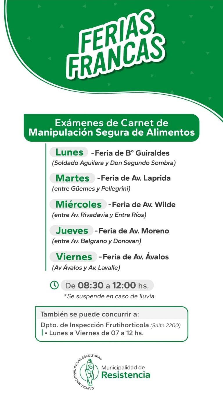 Una vez completado el estudio del manual de manipuladores seguros de alimentos, visto los videos y completado el formulario de inscripción podrán presentarse a rendir con DNI en mano en la Dirección General De Higiene y Control Bromatológico sito en Ameghino 820 en los siguientes turnos: