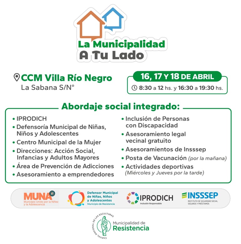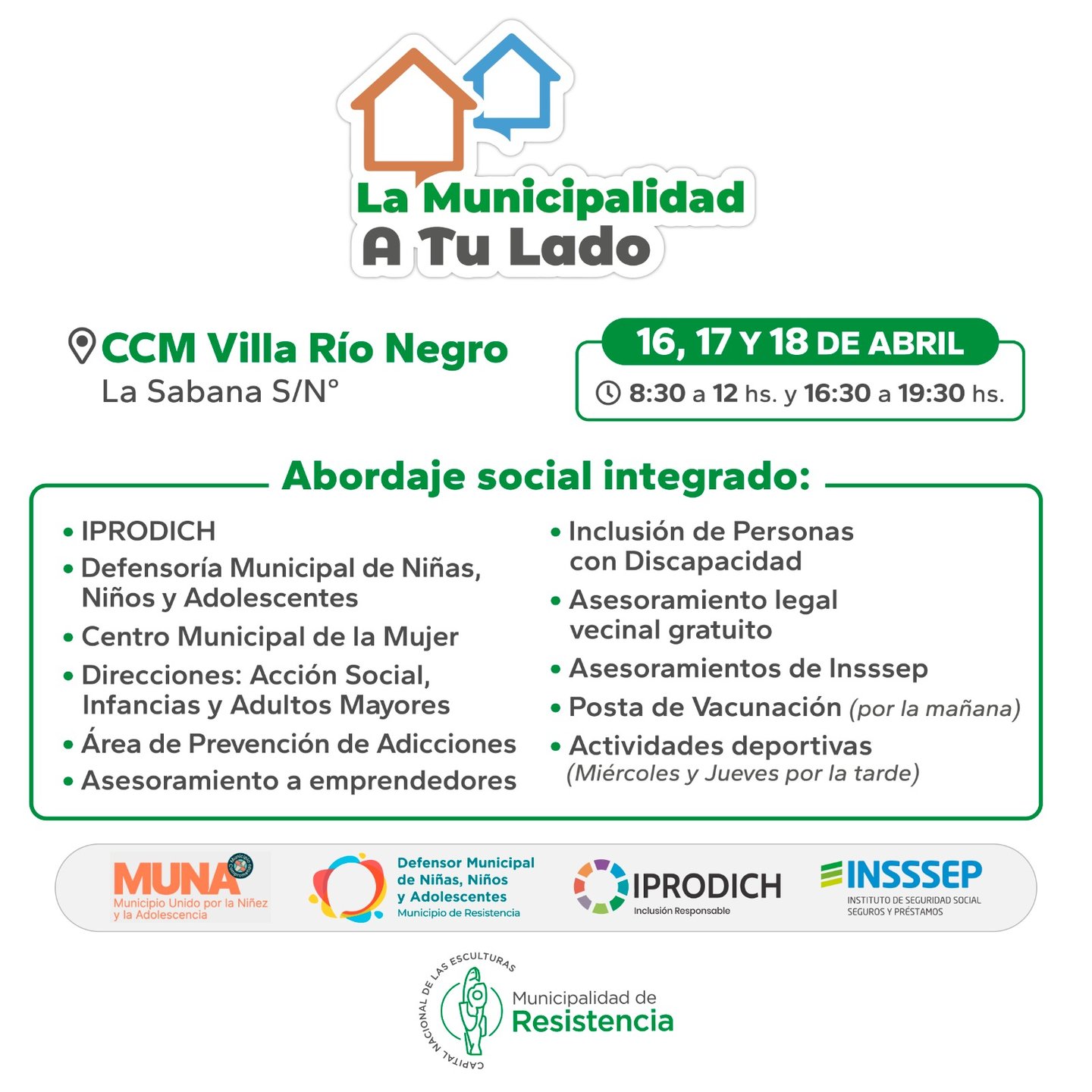 Este abordaje social integrado ya incluye la posibilidad a acceder a trámites de Iprodich; Defensoría Municipal de Niños, Niñas y Adolescentes; Centro Municipal de la Mujer; Direcciones de Acción Social, Infancias y Adultos Mayores; Área de Prevención de Adicciones; Asesoramiento a Emprendedores; Inclusión de Personas con Discapacidad; Asesoramiento Legal Vecinal Gratuito; Asesoramiento de Insssep; Posta de Vacunación (por la mañana); Actividades Deportivas (por la tarde).