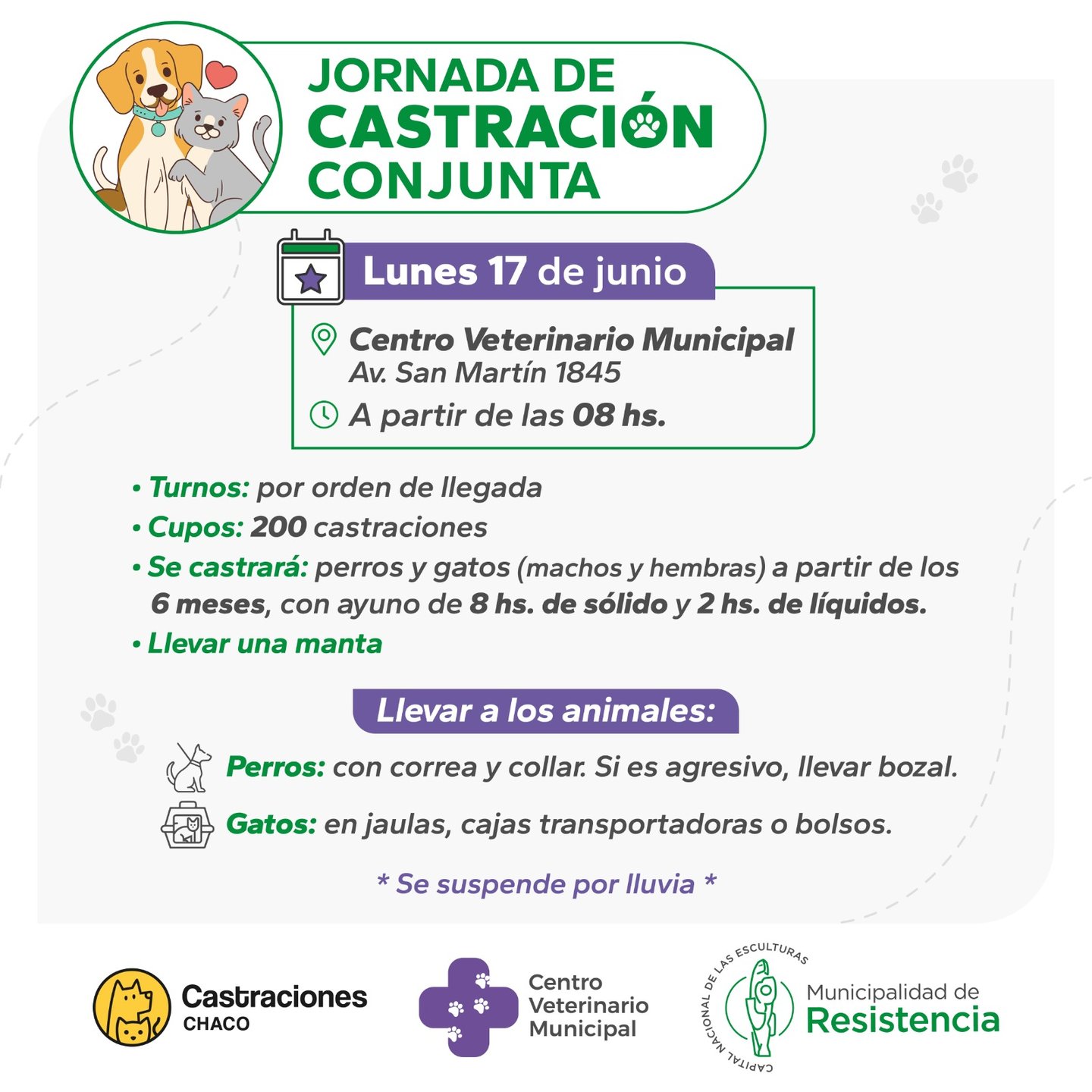 Este lunes, desde las 8, se unen a la Municipalidad de Resistencia para llevar adelante 200 intervenciones en el Centro Veterinario Municipal ubicado en avenida San Martín 1845.