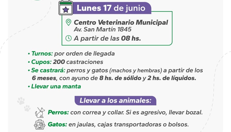Los turnos se entregarán por orden de llegada y los requisitos para que las mascotas sean intervenidas son 8 horas de ayuno de sólidos y 2 horas para los líquidos. Los perros deben concurrir con correa y, si son inquietos o agresivos, con bozal. Los gatos deben concurrir en una mochila, bolsito transportador o caja de cartón para evitar que ese escapen.