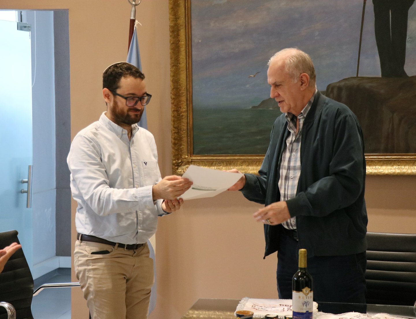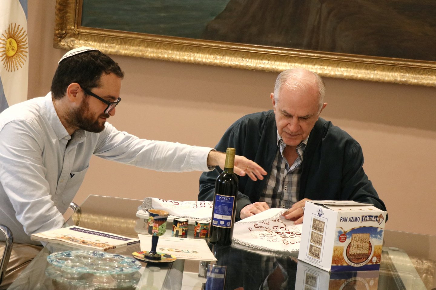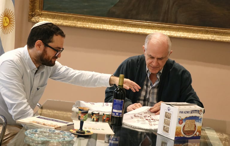 Para visibilizar los rituales se presentaron en la mesa de intendencia los símbolos que se consumen durante el Seder; cena que se lleva adelante las dos primeras noches del Pesaj y cuenta con muchos símboloso como la copa de vino, las velas, el plato con diversos elementos.