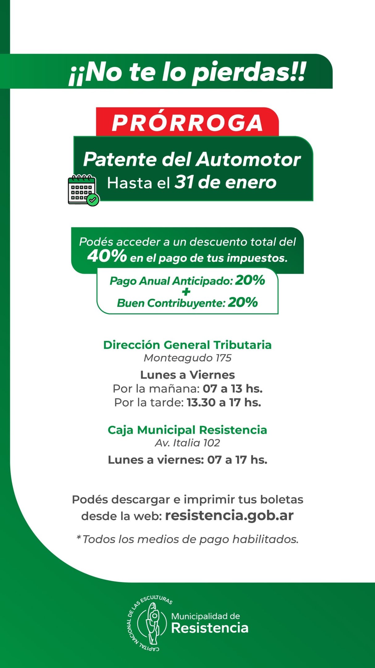 [17/01/2025] - La Municipalidad de Resistencia prorrogó, hasta el 31 de enero, el vencimiento del plazo para el pago anual anticipado de la patente automotor.