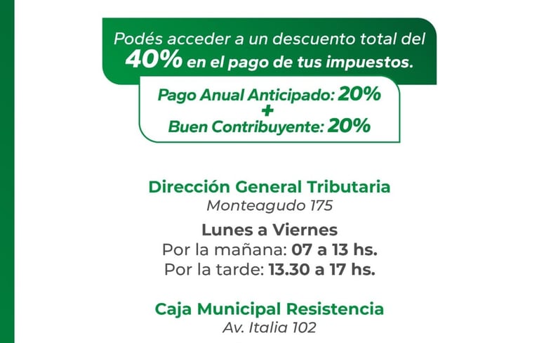 Cabe recordar que los tributos municipales se pueden abonar de manera presencial en la Caja Municipal, Dirección de Tributaria o en las agencias de Lotería Chaqueña, a través del sistema Lotipago. Pueden pagarse en efectivo, tarjetas de débito y crédito, transferencias y por home banking de las redes Link y Banelco.