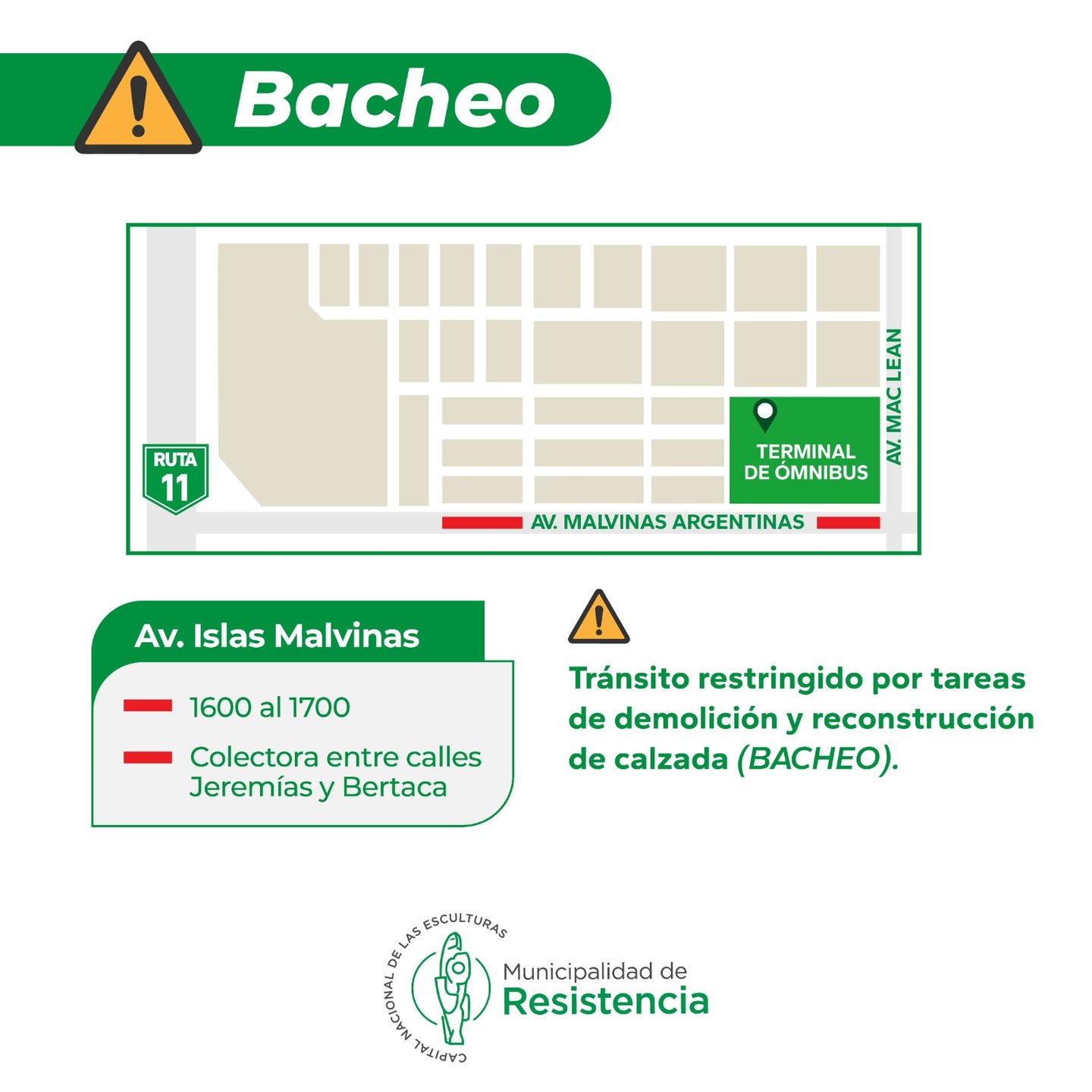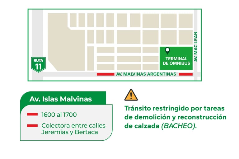 También se ejecutan tareas de demolición y reconstrucción de la calzada de hormigón en la avenida Islas Malvinas, del 1600 al 1700, acceso a la Terminal de Omnibus.