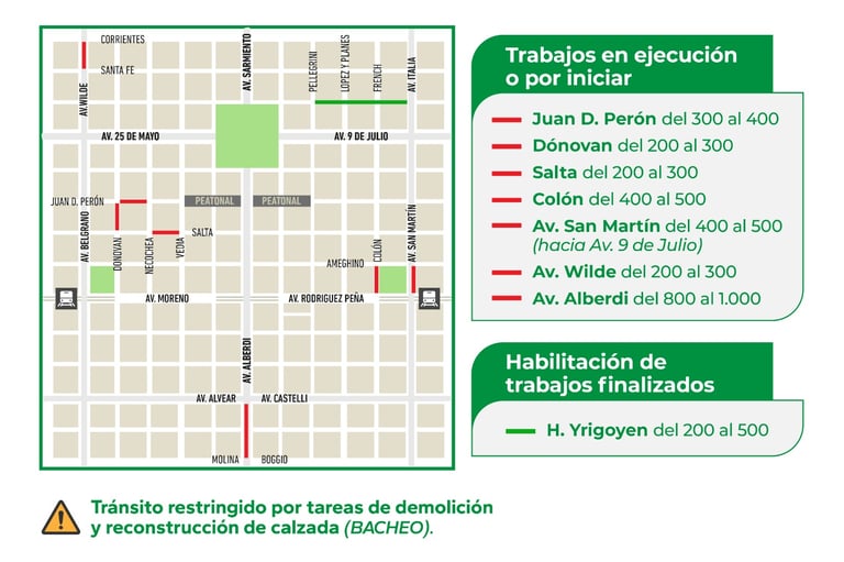 Hay trabajos de demolición, consolidación de base y colado de hormigón en calles Dónovan del 200 al 300; Salta del 200 al 300; Perón del 300 al 400, Colón del 400 al 500 y avenida San Martín del 400 al 500, en el carril hacia 9 de Julio.