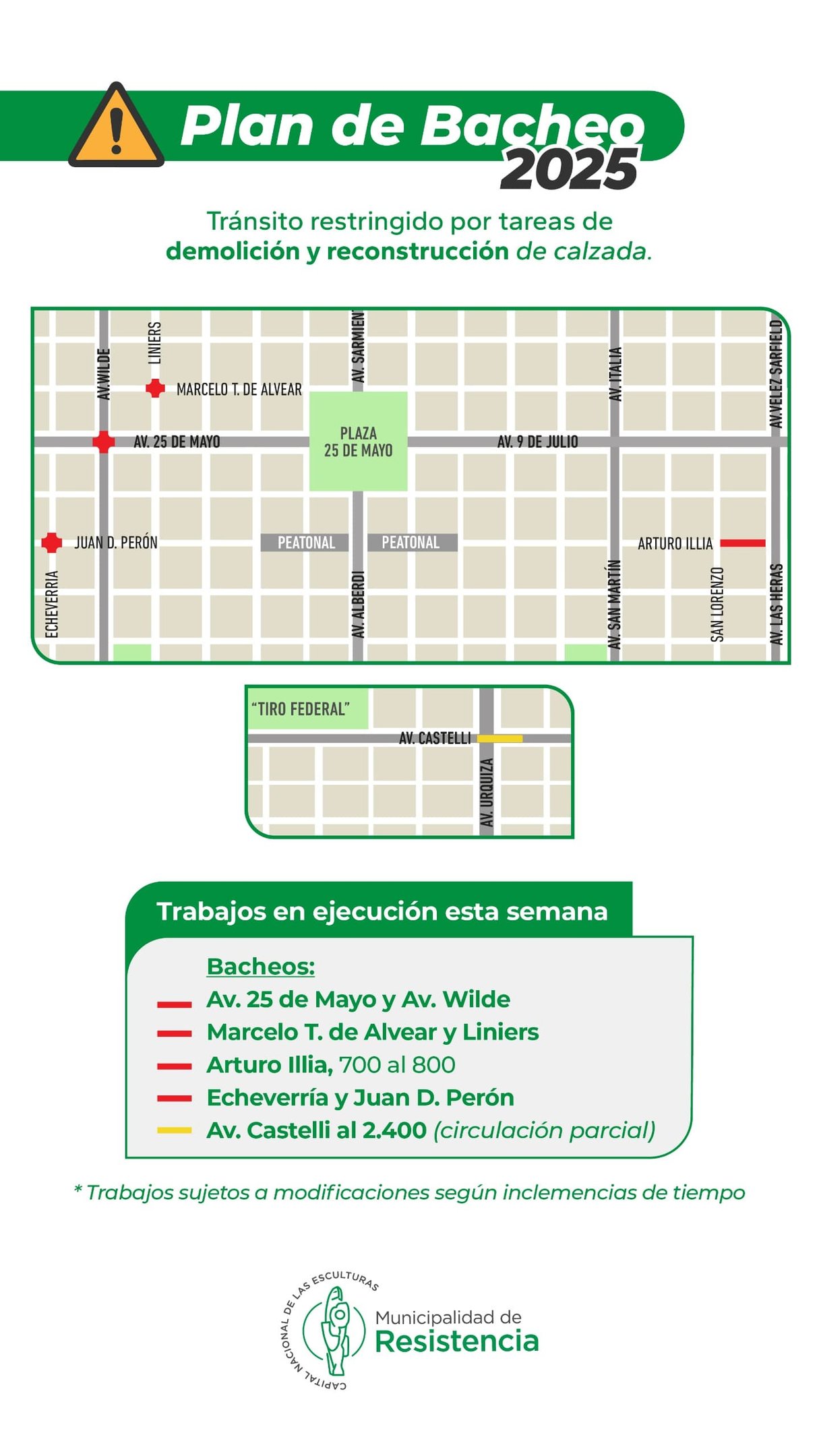 [09/01/2025] - La Municipalidad de Resistencia y Vialidad Provincial informan que, en el marco del Plan de Bacheo 2025, se están interviniendo en las siguientes calles y avenidas: