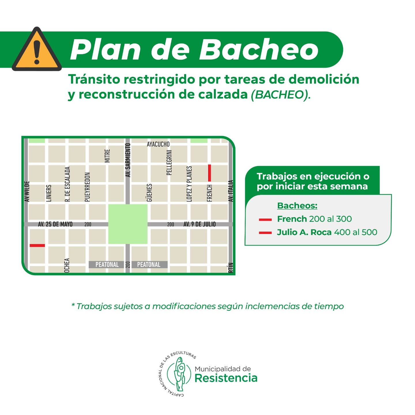[11/11/2024] - La Municipalidad de Resistencia y la Dirección de Vialidad Provincial, informan la continuidad del Programa de Bacheo 2024 en la ciudad. En tal sentido, se ejecutan tareas de demolición, consolidación de base y colado de hormigón en las calles French, del 200 al 300 y en la bocacalle de Julio A. Roca del 400 al 500.