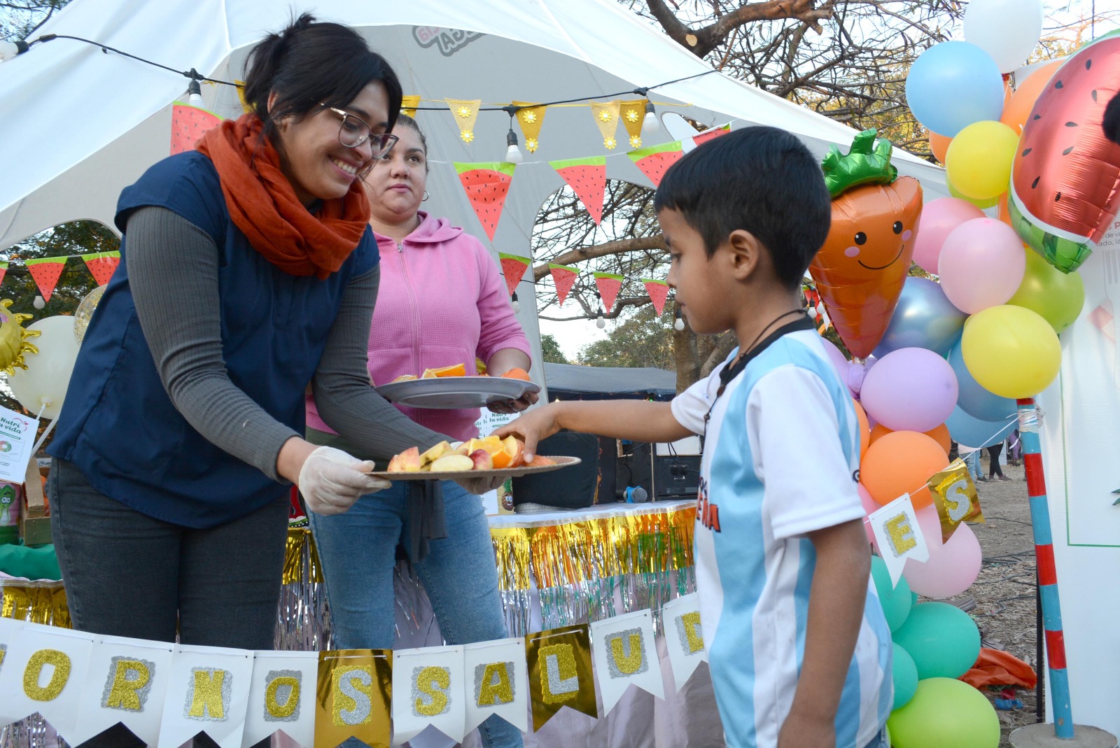 La alimentación saludable y el disfrute de los niños van de la mano en el sector dispuesto por la Subsecretaría de Acción Social. Por un lado, la plaza blanda que cuenta con pelotero inflable y diversos juegos; por otro, la posibilidad de acceder a frutas para recuperar fuerzas naturalmente y recibir información importante al respecto.