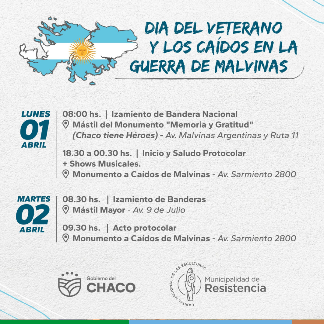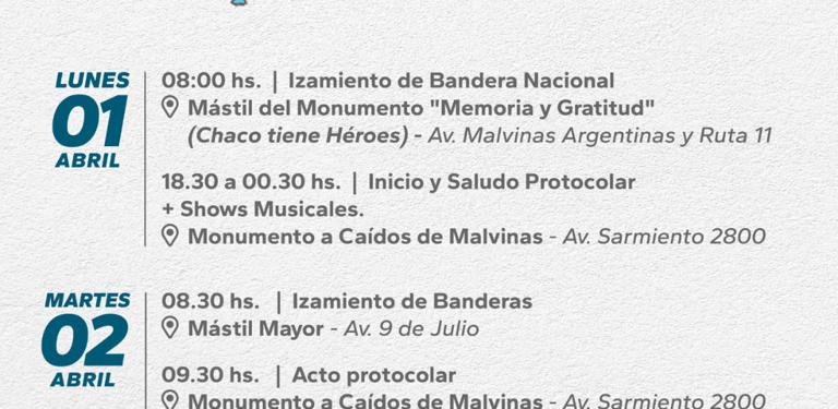1 de abril: 8 horas, en el mástil del Monumento “Memoria y Gratitud” (Chaco tiene héroes) sito en avenida Malvinas Argentinas y la ruta nacional Nº 11. Izamiento de la Bandera Nacional donada por el diputado provincial Carlos Salom.