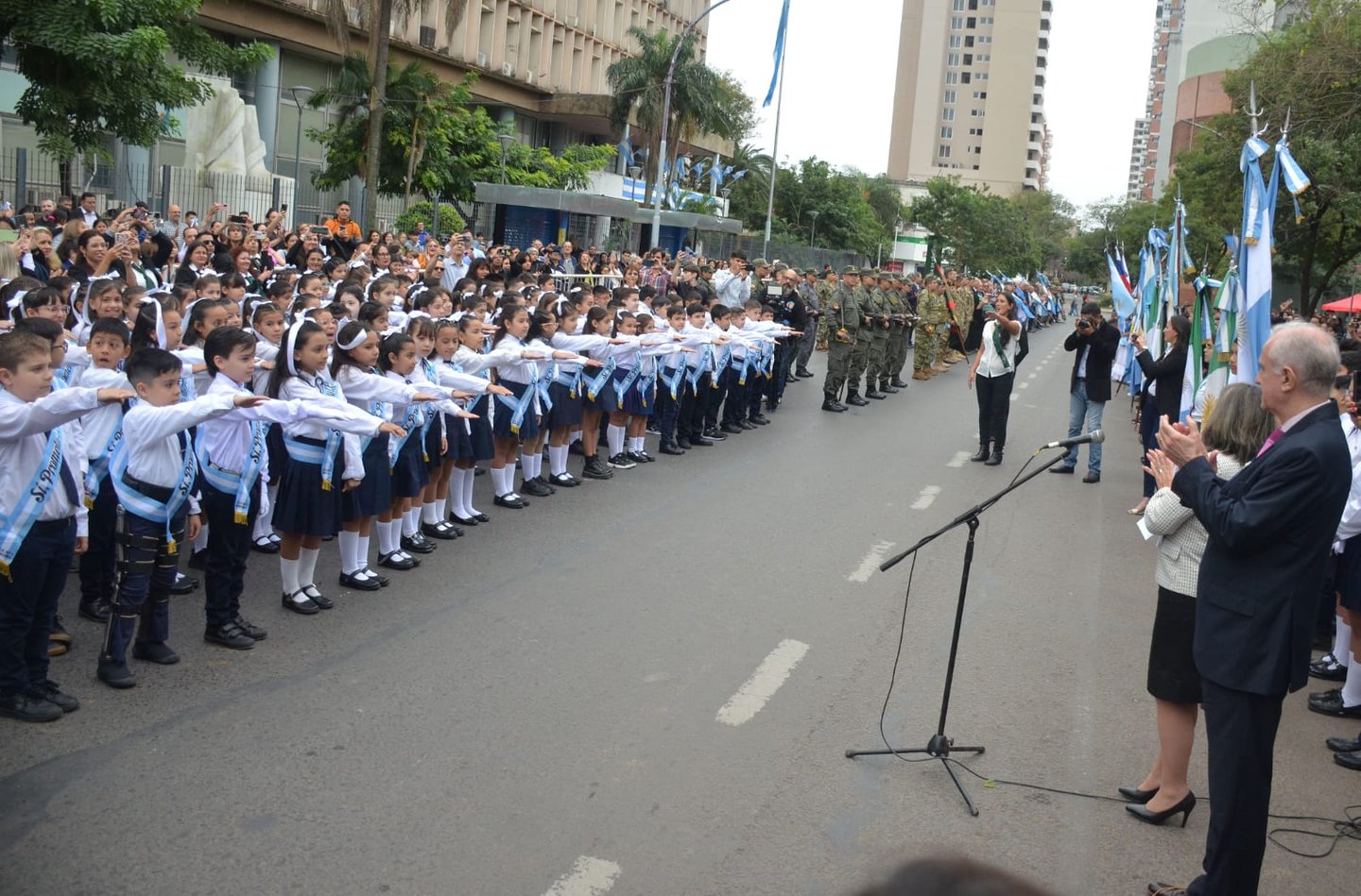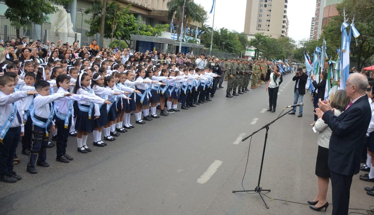 Con marcado fervor patriótico, el pueblo capitalino participó de esta ceremonia que tuvo como uno de los principales puntos la tradicional toma de promesa de lealtad a alumnos primarios de cuarto grado y de juramento a la bandera de guerra a las fuerzas armadas y a excombatientes de Malvinas.