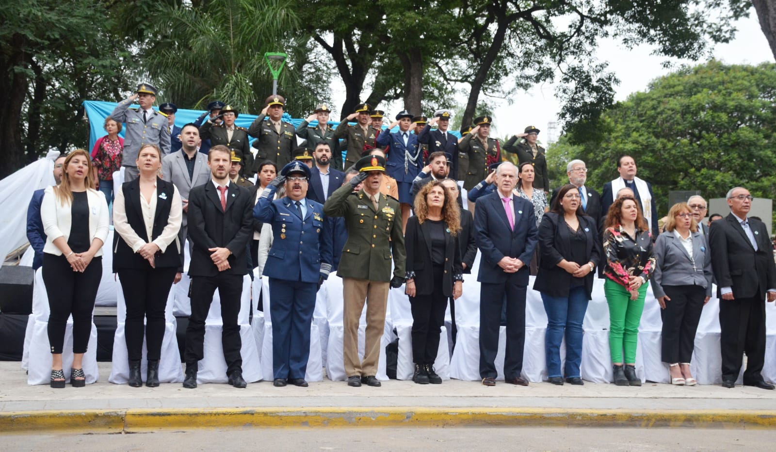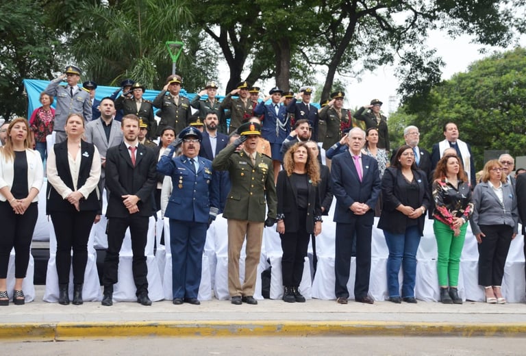 Con la presencia del intendente Roy Nikisch, la ministra del Superior Tribunal de Justicia, Isabel iride de Grillo y autoridades provinciales, municipales, consulares y militares, la ceremonia prosiguió con el izamiento de la insignia nacional en la Plaza Belgrano y posterior ofrenda floral al pie del monumento al general Manuel Belgrano.