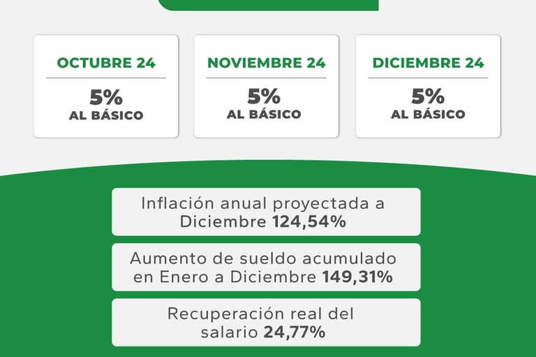 “Este nuevo incremento se dividirá en un 5 por ciento mensual a abonarse con los salarios de octubre, noviembre y diciembre”, agregó.