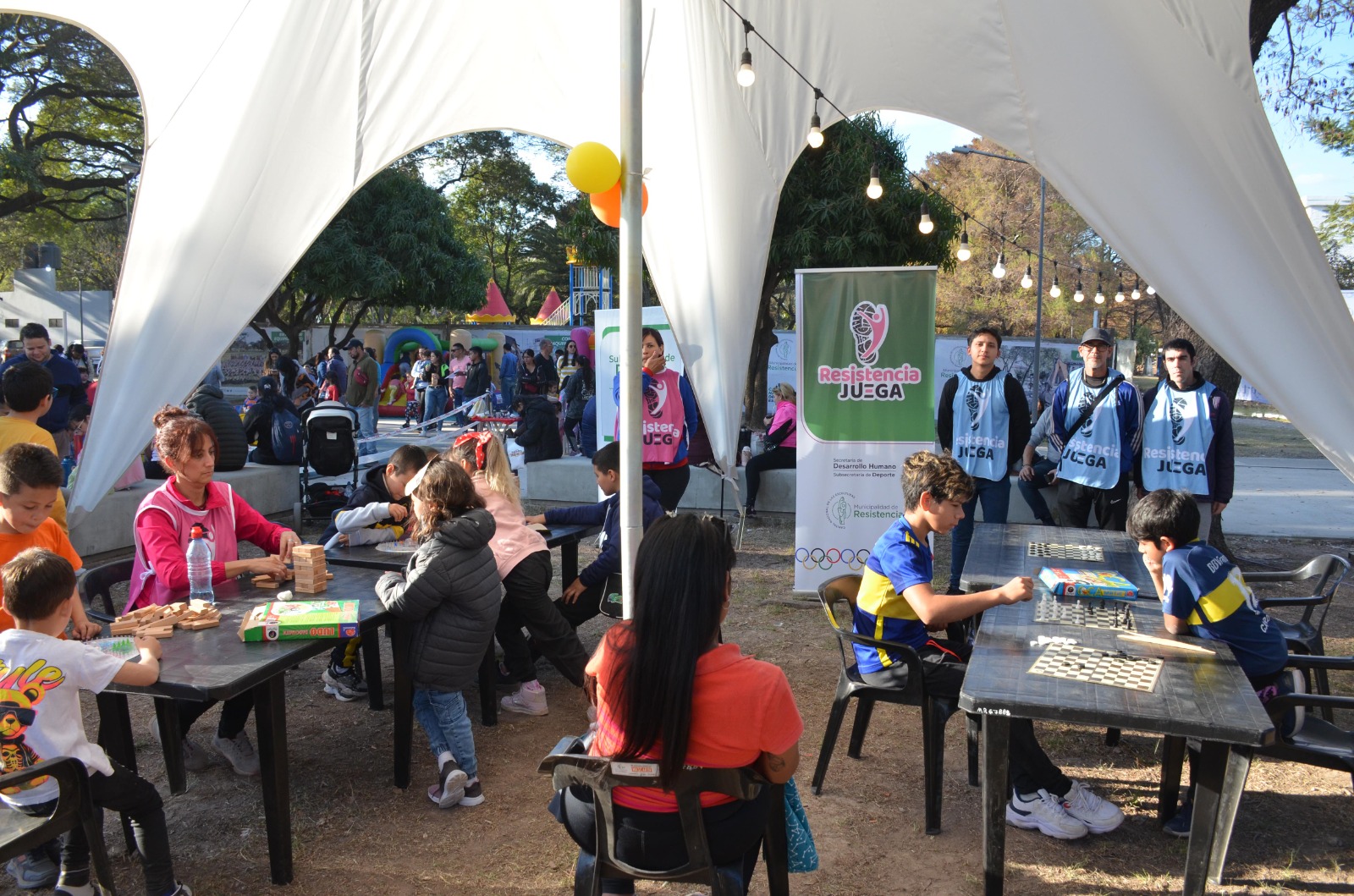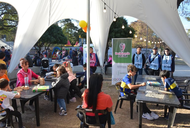 [16/07/2024] - La Municipalidad de Resistencia, a través de la Secretaría de Desarrollo Humano, ofrece un espacio pensado para el entretenimiento de los niños, niñas y adolescentes en la Bienal del Chaco 2024. En la carpa se puede acceder a juegos de mesa como ajedrez o damas; también se encuentran los elementos deportivos para realizar actividades deportivas como vóley, fútbol tenis y fútbol 5; entre otras.