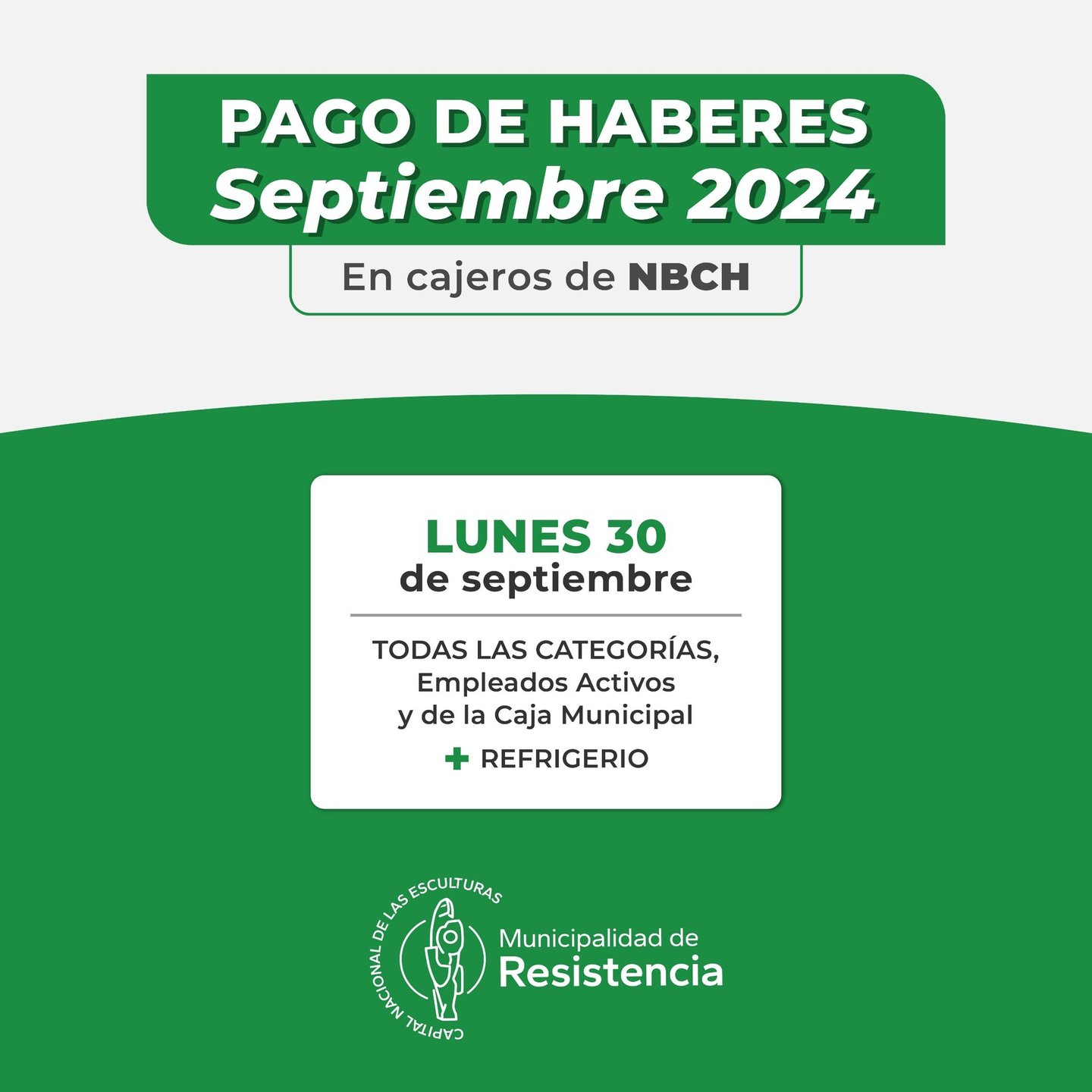 La Municipalidad de Resistencia informa que el próximo lunes 30 de septiembre pagará los sueldos correspondientes al corriente mes a la totalidad del personal de planta permanente.
