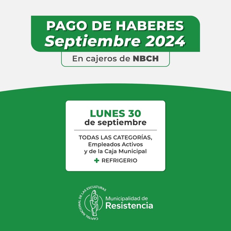 [23/09/2024] - La Municipalidad de Resistencia informa que el próximo lunes 30 de septiembre pagará los sueldos correspondientes al corriente mes a la totalidad del personal de planta permanente.