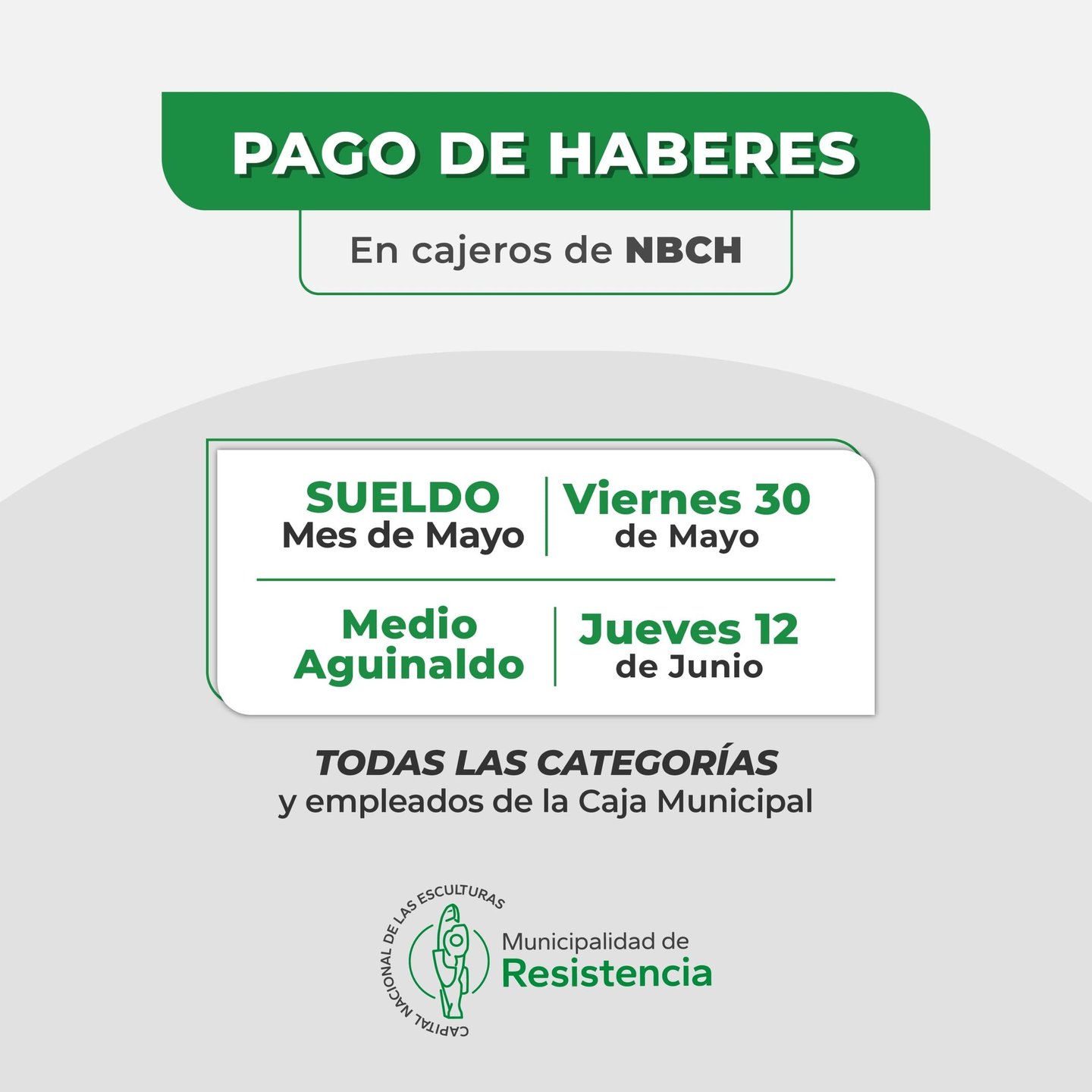 [26/05/2025] - La Municipalidad de Resistencia anunció que este viernes 30 de mayo se abonará el salario correspondiente al corriente mes, junto a los 100 mil pesos en concepto de Refrigerio. Para el 12 de junio está previsto el pago del Sueldo Anual Complementario.