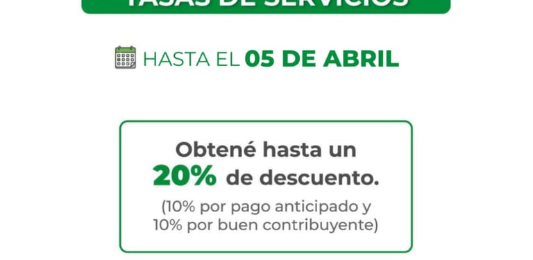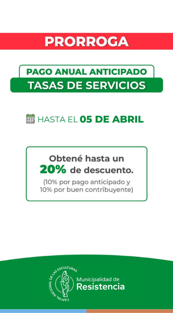 [18/03/2024] - La Municipalidad de Resistencia informó que hasta el 5 de abril estará habilitada la posibilidad de realizar el pago anual anticipado de Tasa de Servicios, con descuentos de hasta un 20%.